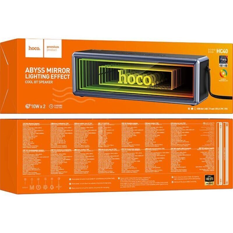 Портативная акустика Hoco HC40 — компактная Bluetooth-колонка для тех, кому важно сочетание выразительного звучания и свободы перемещения. Модель рассчитана на активное использование в помещении и на улице: дома, на прогулках, в поездках или на встречах с друзьями. Два динамика обеспечивают объёмное и громкое звучание с акцентированными низкими частотами и чистыми верхами, а форма корпуса способствует равномерному распределению звука вокруг. Поддержка различных режимов воспроизведения упрощает подключение к разным источникам, а стабильное беспроводное соединение делает использование комфортным в любых сценариях. Встроенный аккумулятор рассчитан на продолжительную автономную работу, а влагозащита позволяет не переживать из-за брызг воды или лёгкого дождя. Зеркальный световой эффект добавляет колонке визуальную динамику и создаёт атмосферу во время прослушивания. Прочный корпус из ABS-пластика в сочетании с ремешком для переноски делает устройство надёжным спутником в дороге и на отдыхе.