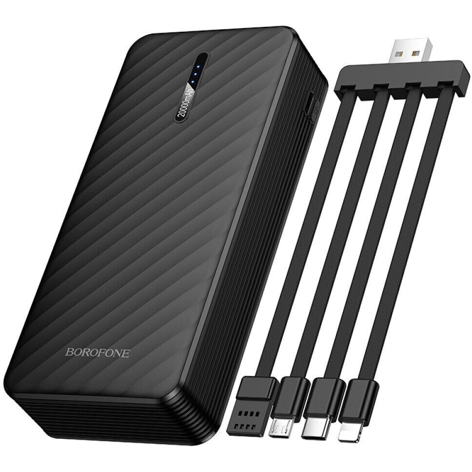 Внешний аккумулятор BOROFONE BJ84A 10W (20000mAh) + кабель MicroUSB + Type-C + Lightning + USB — удобный павербанк для ежедневной подзарядки сразу нескольких устройств без лишних проводов. Ёмкости 20000 мА·ч достаточно, чтобы надолго снизить зависимость от розетки и поддерживать работу смартфонов, наушников, планшетов и другой техники в течение дня. Главное преимущество модели — набор встроенных кабелей MicroUSB, USB-C, USB-A и Lightning: они аккуратно интегрированы в корпус и подключаются через USB-A коннектор, который вставляется в порт, поэтому кабели можно быстро снять, если они не нужны. Такое решение особенно удобно, когда у вас устройства разных типов и важно держать всё необходимое для зарядки под рукой, не увеличивая количество аксессуаров.