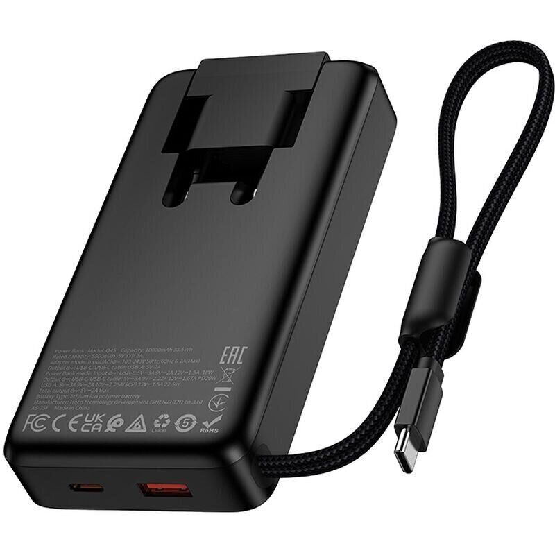 Внешний аккумулятор Hoco Q45 22.5W+PD20W (10000mAh) + кабель Type-C — универсальный power bank для тех, кому важны мобильность, быстрая зарядка и продуманный формат. Компактный корпус из прочного ABS-пластика удобно лежит в руке и не занимает много места в сумке, а складная сетевая вилка позволяет использовать устройство не только как пауэрбанк, но и как сетевое зарядное — без дополнительных адаптеров. Модель поддерживает Power Delivery до 20 Вт и QC до 22,5 Вт, обеспечивая эффективную зарядку смартфонов, планшетов и других гаджетов. Встроенный кабель USB-C, а также дополнительные порты USB-C и USB-A дают возможность заряжать до трёх устройств одновременно. Цифровой дисплей показывает точный уровень заряда, помогая контролировать оставшуюся ёмкость и вовремя планировать подзарядку. Для удобства хранения предусмотрена клипса-фиксатор кабеля, а универсальный вход USB-C упрощает подключение дома и в дороге.