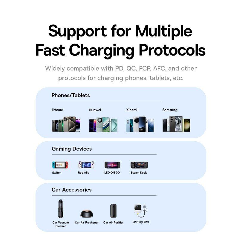 - Мощность до 30 Вт обеспечивает быструю зарядку совместимых гаджетов, что особенно удобно при коротких поездках;
