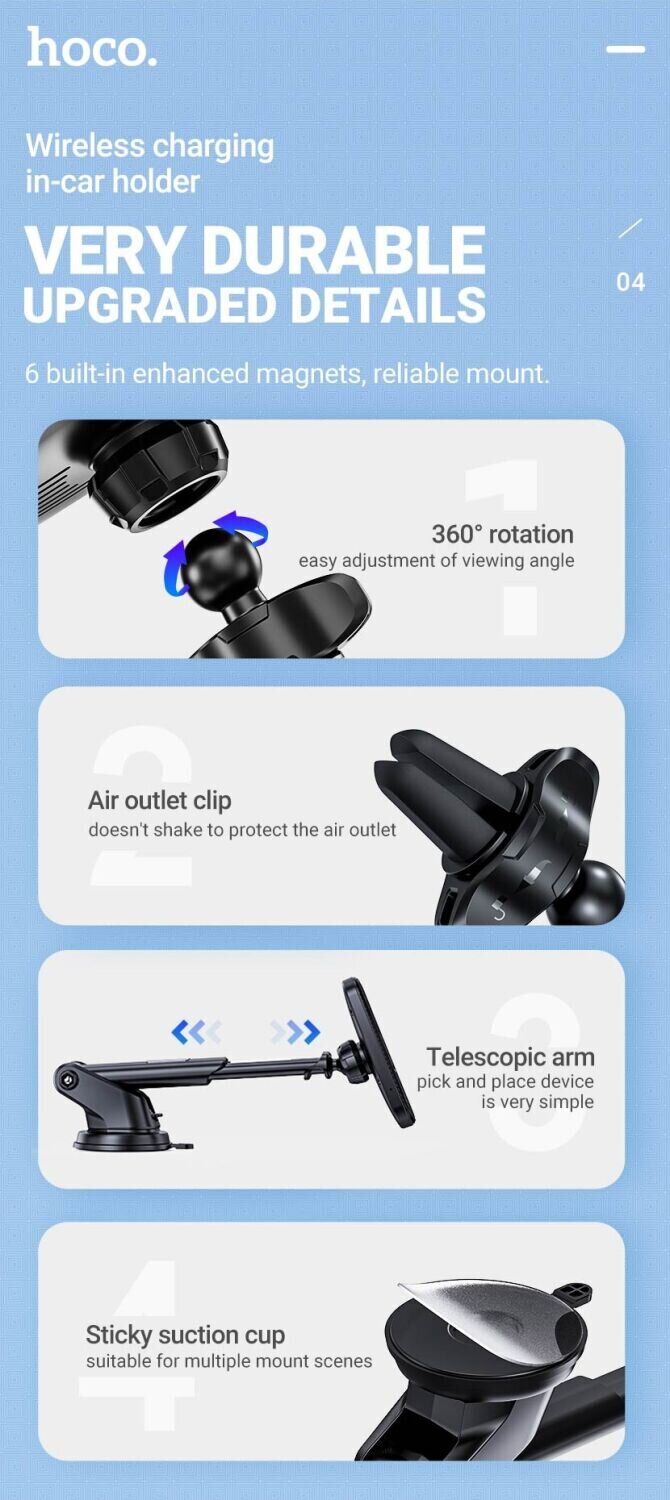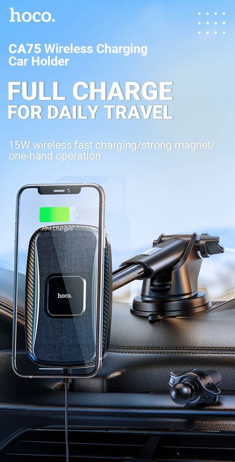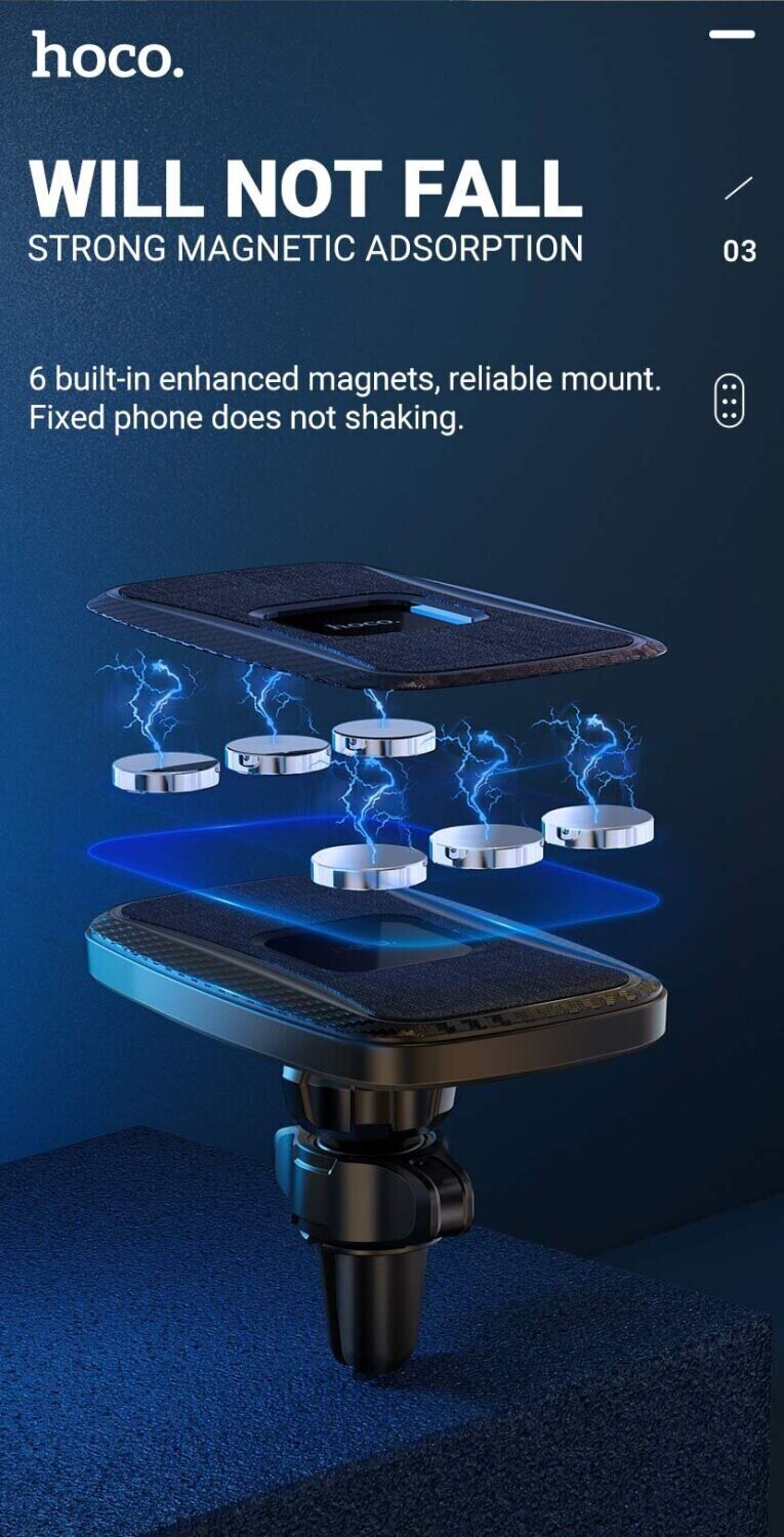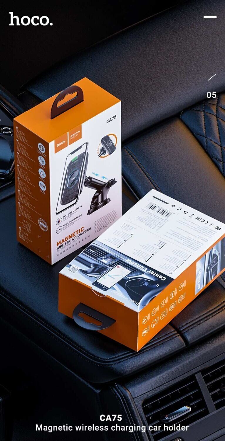 Автомобильный держатель Hoco CA75 обладает 6-ю встроенными магнитами, что являются довольно мощными и гарантируют надёжное сцепление смартфона с удерживающей поверхностью аксессуара. Кроме того, холдер снабжается набором съемных креплений, которые позволят закрепить его в любом удобном месте. Также держатель оснащён возможностью беспроводной зарядки, максимальная мощность которой достигает 15W, что несомненно добавит комфорта в ежедневные поездки.