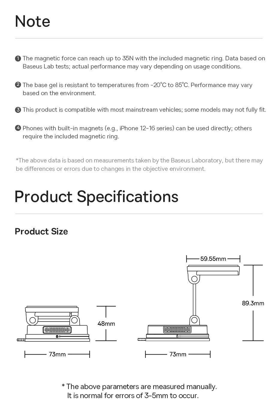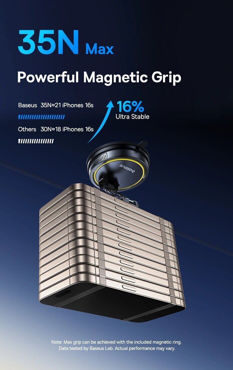 - Магнитная фиксация с силой притяжения до 35N для надёжного удержания смартфона;