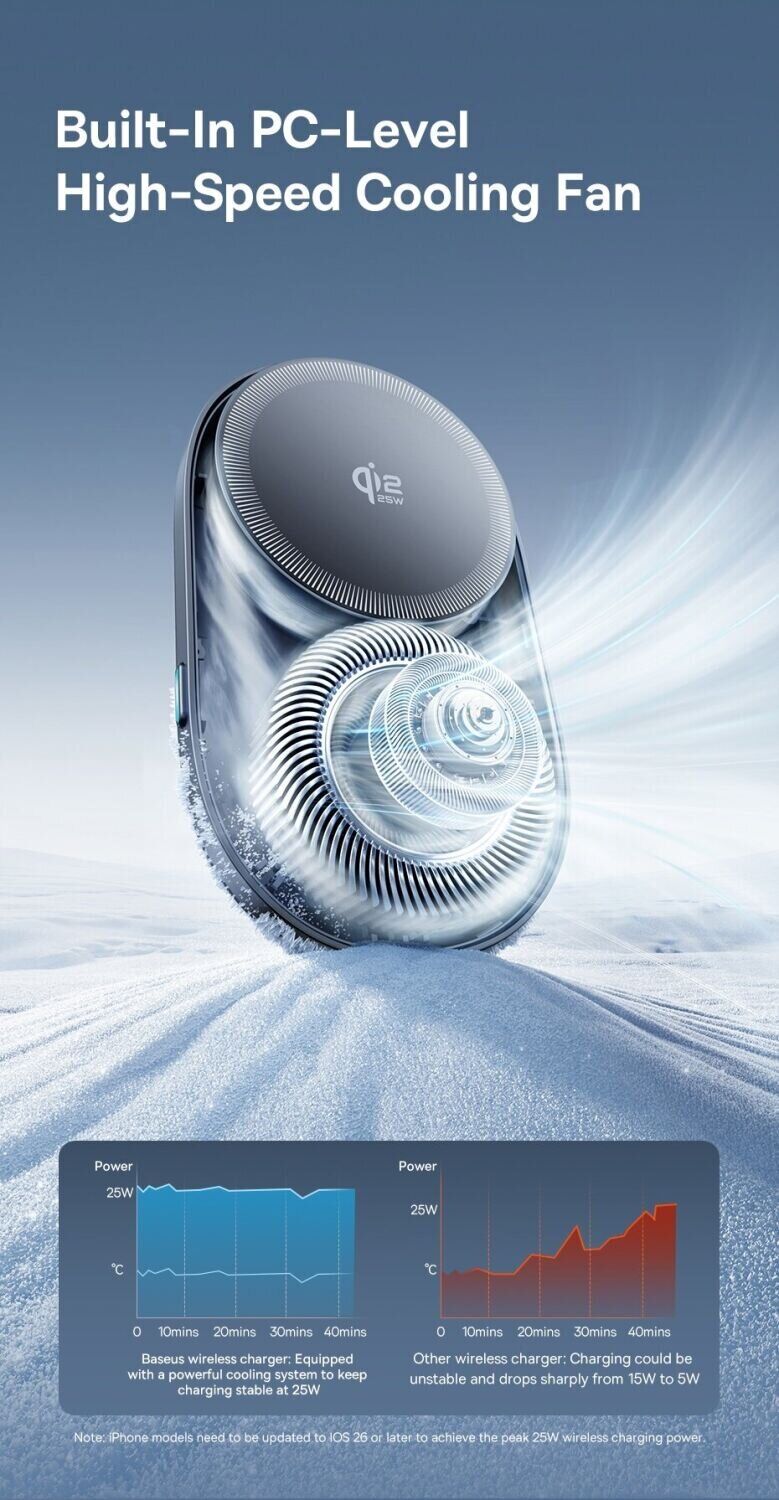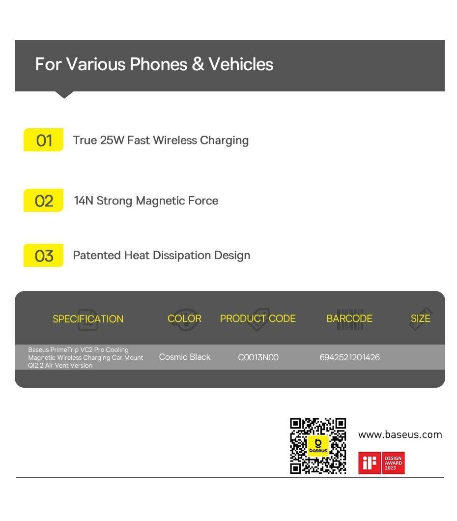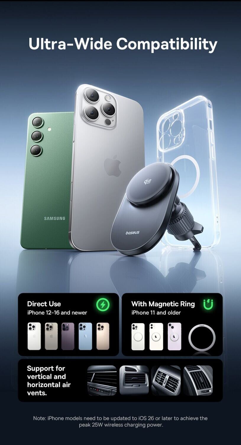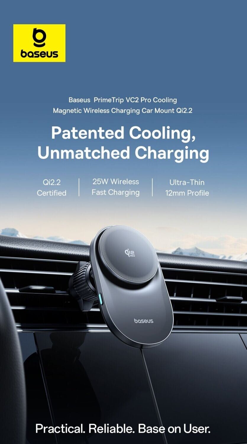 Автомобильный держатель с беспроводной зарядкой Baseus PrimeTrip VC2 Pro (C0013N00) — это функциональный аксессуар, который объединяет магнитное крепление и быструю зарядку для удобного использования смартфона в дороге. Поддержка стандарта Qi2 с мощностью до 25 Вт позволяет эффективно заряжать устройство во время поездок без подключения кабелей. Сильные магниты обеспечивают стабильную фиксацию смартфона, снижая риск смещения даже на неровной дороге. Встроенная система охлаждения с вентилятором помогает поддерживать стабильную работу и уменьшает нагрев при длительной зарядке. Крепление на вентиляционную решётку обеспечивает надёжную установку, а поворотный шарнир на 360° позволяет легко выбрать удобный угол обзора.