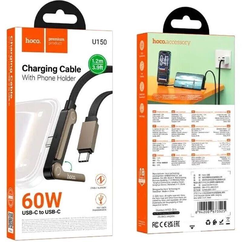 Кабель Hoco U150 Type-C to Type-C 60W (3A, 1.2m) — это надёжный аксессуар для зарядки и передачи данных, рассчитанный на повседневное использование. Он подходит для смартфонов, планшетов и ноутбуков, обеспечивая стабильную подачу энергии и корректную синхронизацию. Прочная нейлоновая оплётка защищает кабель от износа, перегибов и механических повреждений, а коннекторы из цинкового сплава повышают долговечность и обеспечивают стабильное соединение. Угловой штекер делает использование более удобным во время зарядки, снижая нагрузку на разъём. Дополнительно предусмотрена складная конструкция, позволяющая использовать кабель как подставку для смартфона.