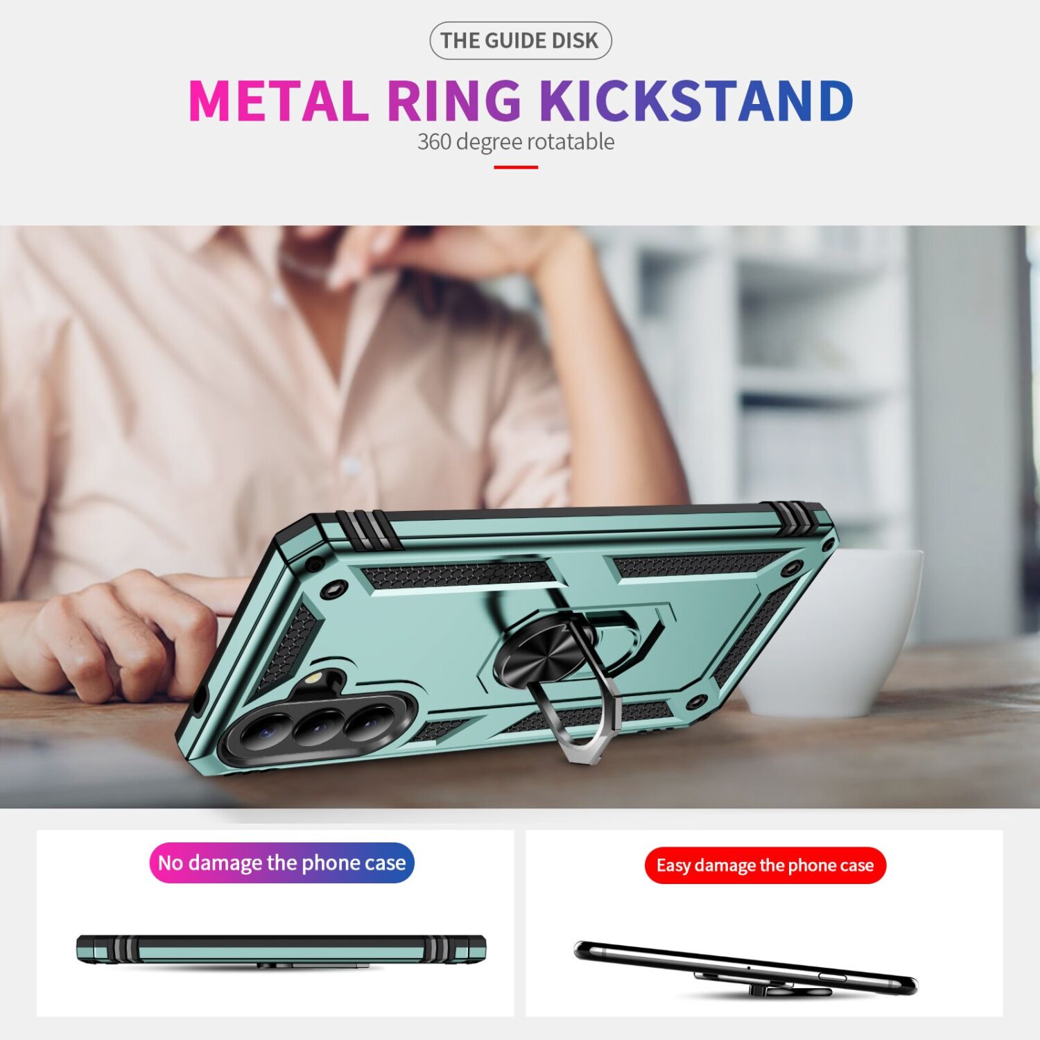 - Стильное металлическое кольцо служит как держатель для пальца и как подставка для устройства;