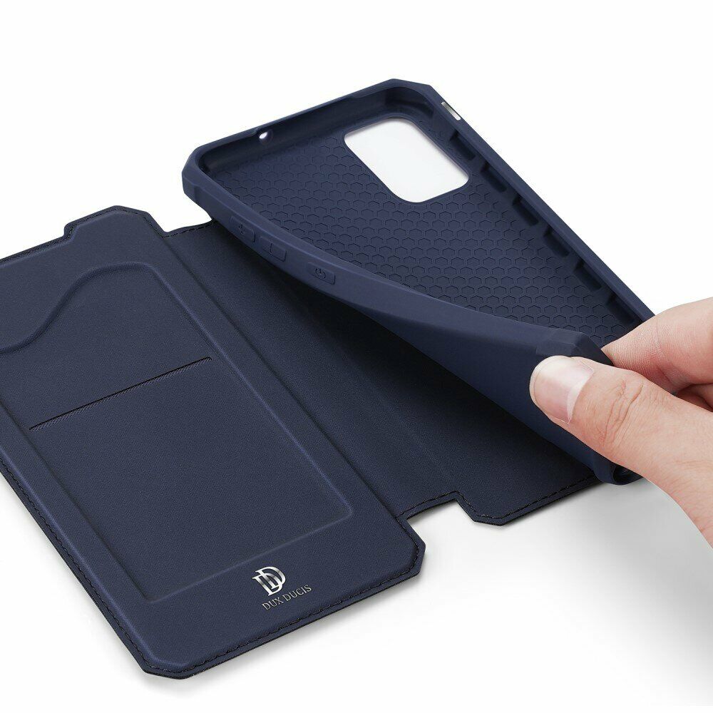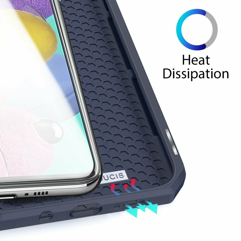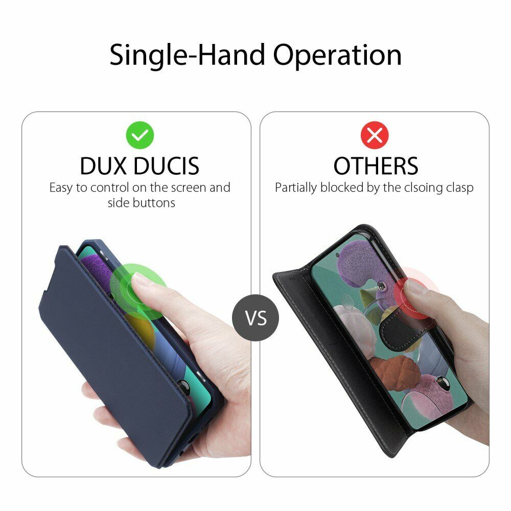 Чехол DUX DUCIS Skin X Series – это отличное решение, чтобы защитить ваш Samsung Galaxy A51 (А515) от большинства неприятностей, то и дело оставляющих свои отметины на корпусе в процессе ежедневного использования. Его конструкция состоит из двух элементов: основы-держателя из эластичного термополиуретана, устойчивого к деформации и хорошо смягчающего удары, а также обложки с текстурированного полиуретана, тактильно приятная фактура которой способствует лучшей ухватистости смартфона, а также не собирает на себе грязь и отпечатки. На внутренней поверхности есть небольшой удобный кармашек, в который можно будет спрягать пластиковую карту, симку или какую-нибудь мелочь. Для портов и камеры смартфона в чехле имеются специальные отверстия, для клавиш же предусмотрели мягкие повторители, дополнительно оберегающие те от попадания грязи и влаги. Для фиксации верхней крышки предусмотрен магнитный замок, цепко удерживающий её в закрытом положении, когда вы не пользуетесь смартфоном. Также при необходимости её можно сложить в подставку, существенно повышая удобство просмотра видео или чтения с экрана.