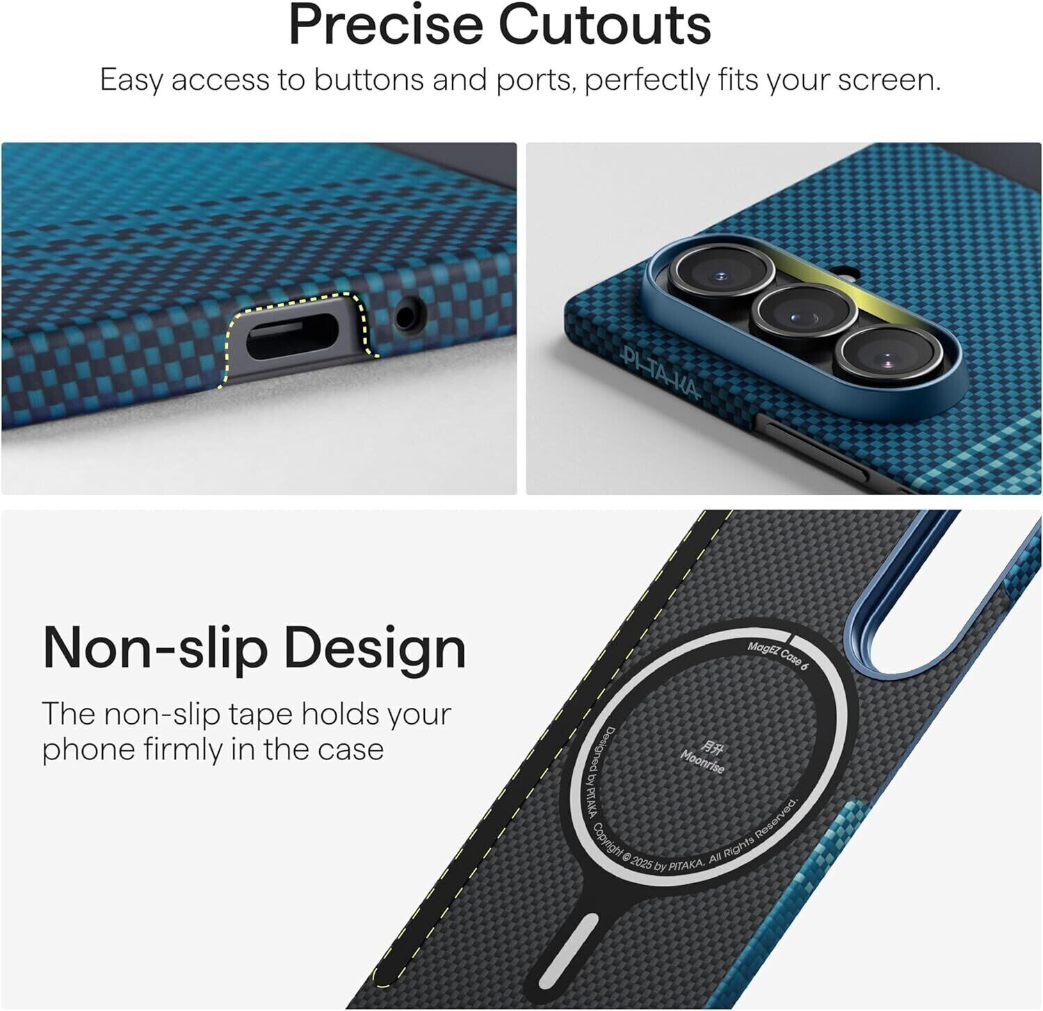 Защитный чехол Pitaka Ultra-Slim Case (FF) для Samsung Galaxy Fold 7 – это премиальный аксессуар для тех, кто выбирает безупречное качество и современный дизайн. Он создан из арамидного волокна авиационного класса, которое сочетает легкость, надежность и стойкость к износу. Тонкий корпус толщиной всего около 1 мм практически не утолщает устройство, сохраняя его элегантные линии. Уникальная технология Fusion Weaving придает чехлу характерную текстуру и подчеркивает его статусность. Чехол интегрируется в магнитную систему MagEZ 2.0 и поддерживает использование с большинством аксессуаров MagSafe, при этом не препятствуя беспроводной зарядке. Дополнительная защита камеры достигается благодаря аккуратному выступу, продуманному специально для модели Fold 7.