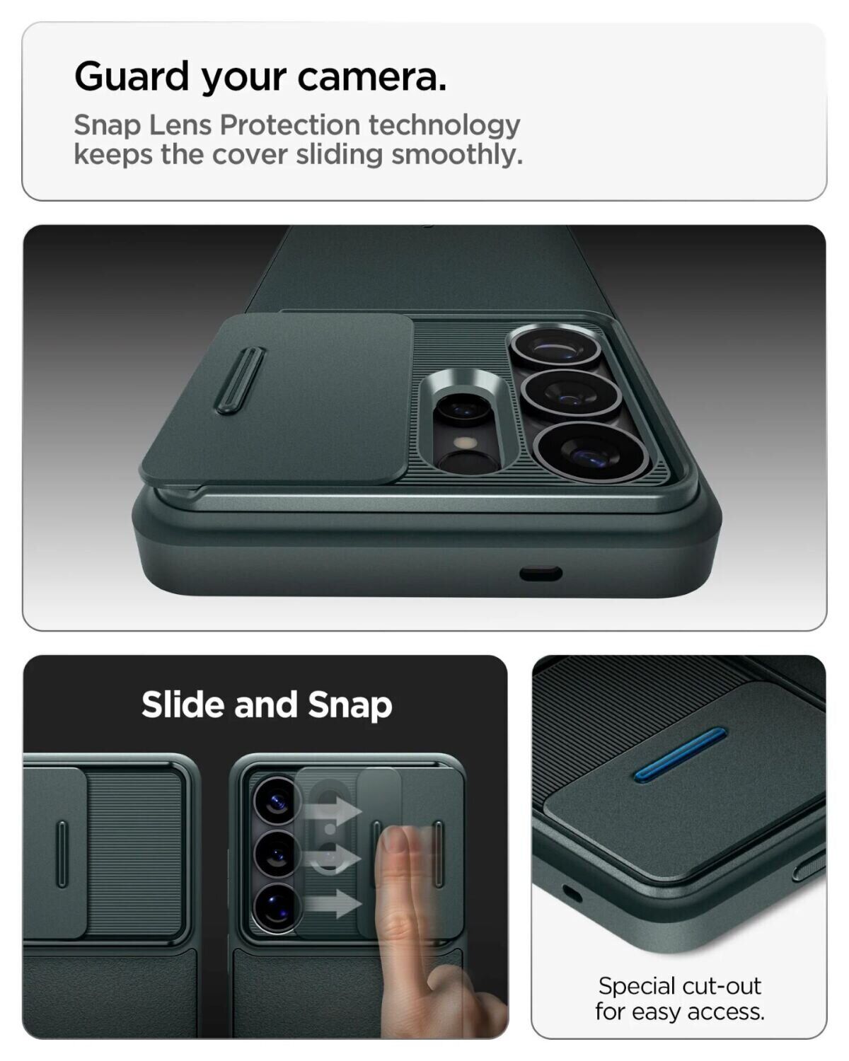 Optik Armor от компании Spigen (SGP) – эффективное решение для комплексной защиты корпуса Samsung Galaxy S26 Ultra (S948) от грязи и механических повреждений. Чехол плотно фиксируется на смартфоне, надежно оберегая его тыльную и боковые грани. Главная же особенность конструкции кроется в наличии специальной "шторки", которая будет прикрывать объектив камеры, когда вы ею не пользуетесь, и легко открываться одним движением, когда надо сделать снимок. В основе здесь лежит эластичный термополиуретан, который хорошо справляется с ударами и небольшим и падениями. Механизм шторки выполнен из прочного пластика, который создает дополнительную защиту верхней части аппарата. Шероховатая фактура внешнего покрытия аксессуара приятна на ощупь, не собирает на себе отпечатки и не будет скользит в руке. Для всех функциональных разъемов производителем предусмотрены необходимые отверстия, для портов – мягкие пылезащитные дубликаторы.