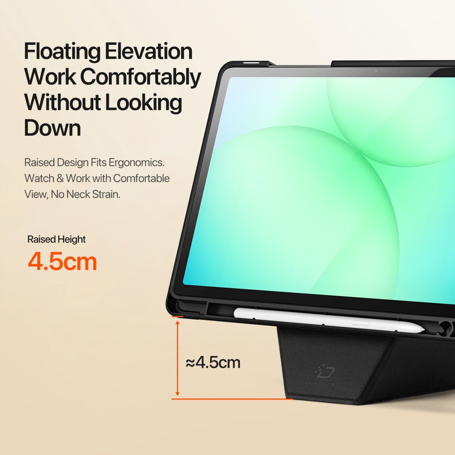 - Плавающая конструкция подставки приподнимает планшет примерно на 4,5 см, обеспечивая более удобный угол обзора и уменьшая нагрузку на шею при длительной работе;