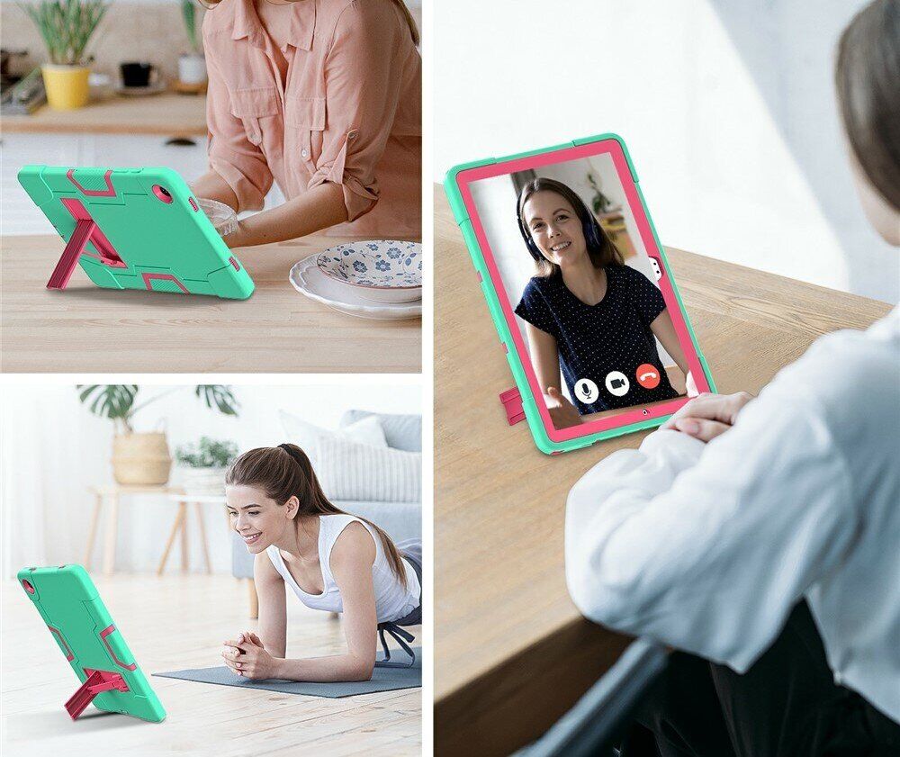 Deexe Color Kickstand – это настоящая броня для Samsung Galaxy Tab A11 Plus (X230/236), способная гарантировать высочайший уровень защиты от царапин, потёртостей, трещин и множества других механических повреждений. Конструкция чехла представляет собой комбинацию из прочной пластиковой основы, куда вставляется планшет, пластиковой рамки-фиксатора, а также силиконовой обложки, плотно их облегающей и выполняющей роль амортизатора. Внешняя поверхность приятна на ощупь, устойчива к загрязнению и не будет скользить в руках. Сзади на спинке можно найти специальную откидывающуюся подставку, при помощи которой можно удобно зафиксировать планшет на любой ровной поверхности, облегчая просмотр видео и чтение с экрана.