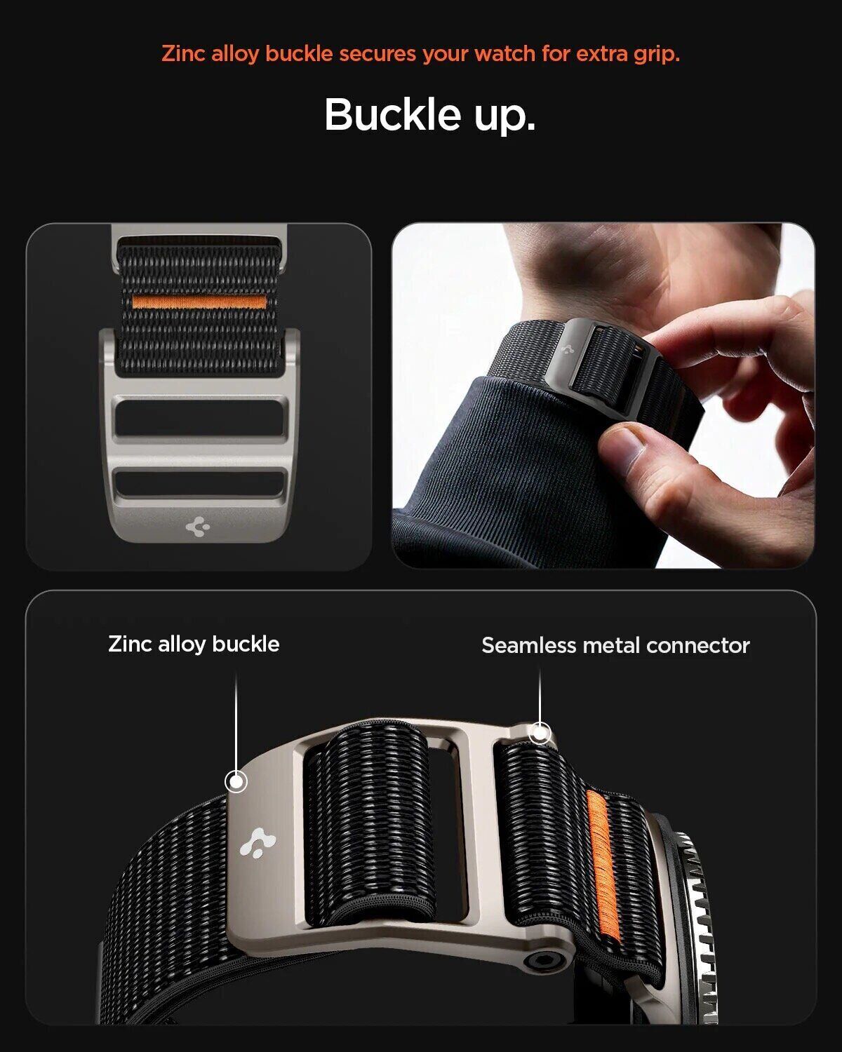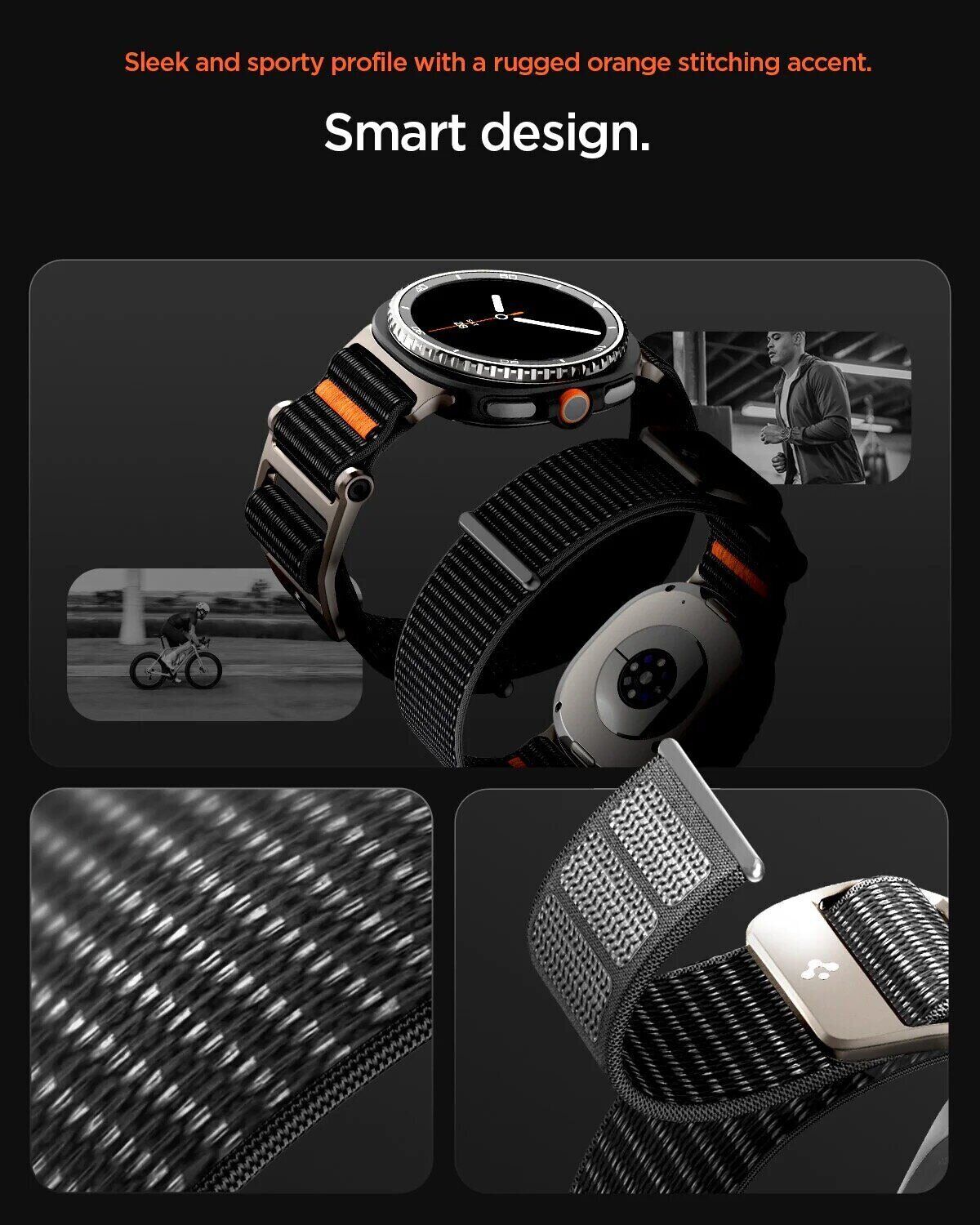 Ремешок Spigen (SGP) DuraPro Flex Ultra для Samsung Galaxy Watch 8 (40/44mm) / 8 Classic — это стильный и функциональный аксессуар, сочетающий прочность, комфорт и современный дизайн. Выполненный из высококачественного нейлона с яркой оранжевой декоративной строчкой, он отличается повышенной износостойкостью и приятной текстурой. Лёгкий, дышащий материал обеспечивает комфорт даже при длительном ношении, а надёжная застёжка на липучке гарантирует идеальную фиксацию на запястье. Металлическая пряжка из цинкового сплава придаёт ремешку изысканный акцент и повышает его долговечность. Благодаря регулируемой длине, Spigen DuraPro Flex Ultra подходит для большинства пользователей и идеально дополняет стильные часы Samsung Galaxy Watch 8.