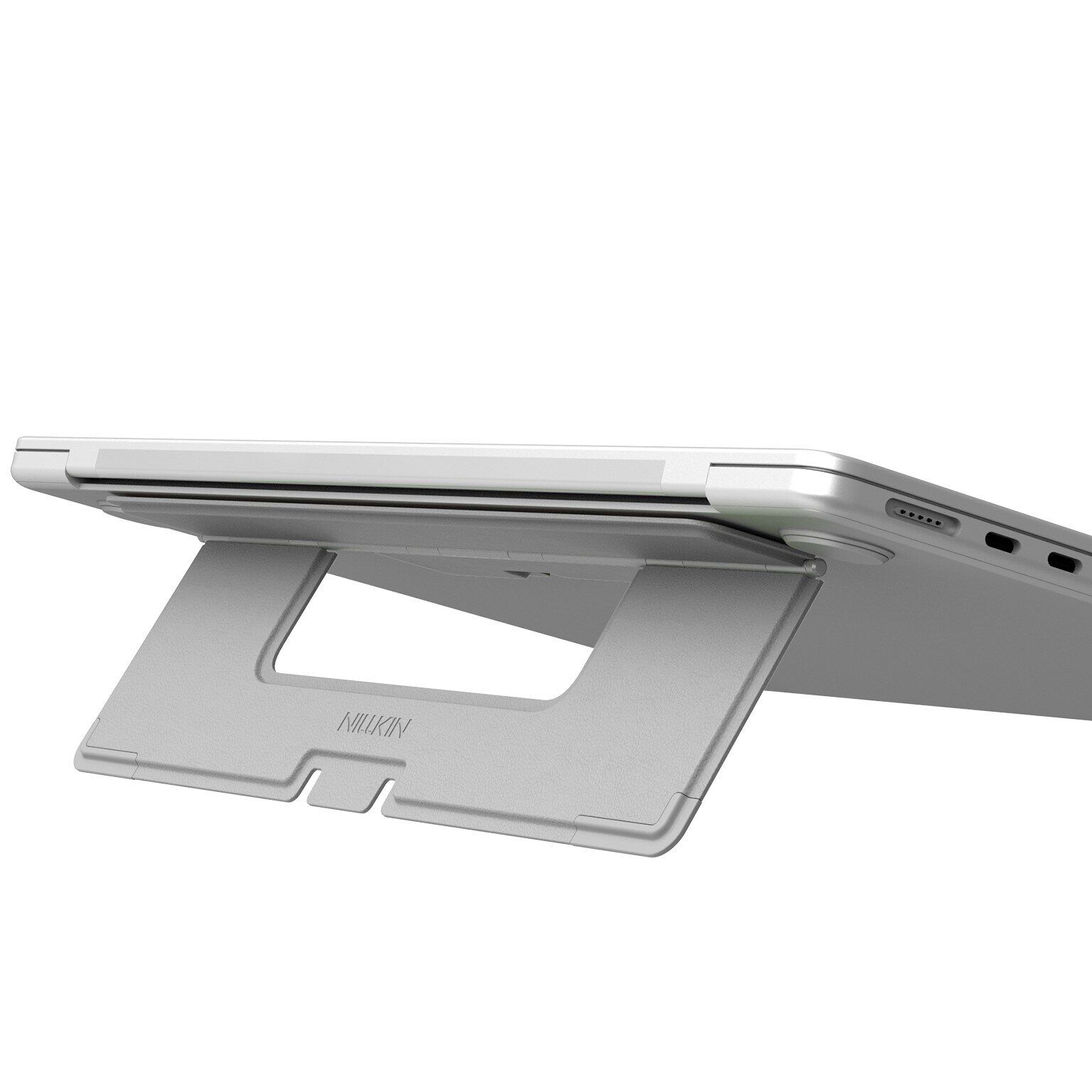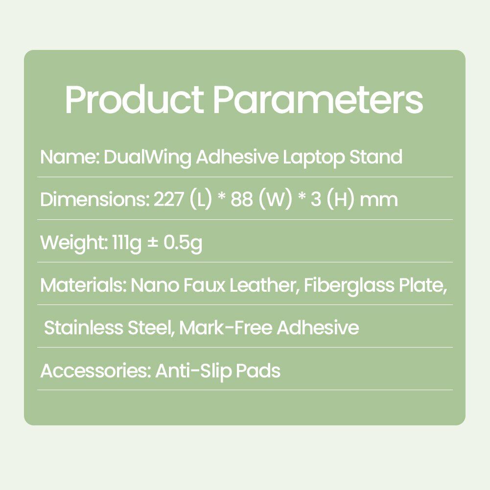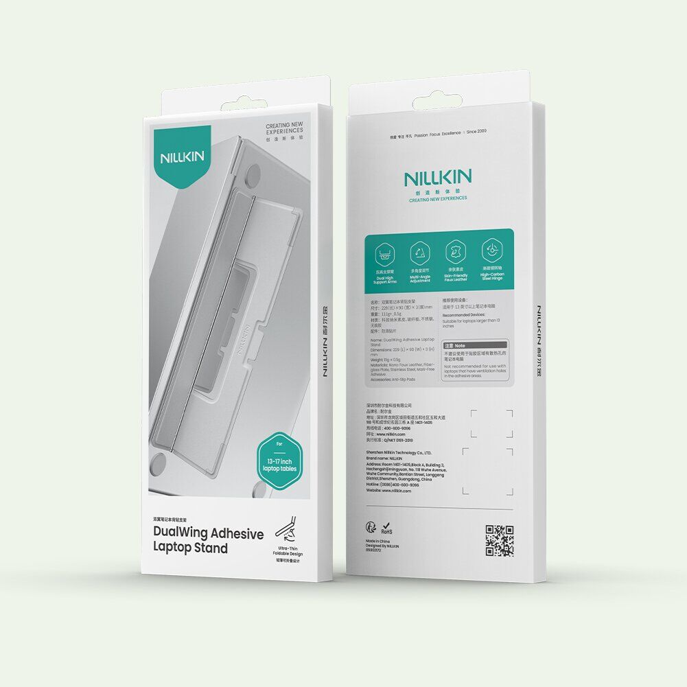 Подставка для ноутбука NILLKIN DualWing Adhesive Laptop Stand разработана для удобной работы за столом и помогает подобрать комфортный угол наклона устройства. Её дизайн вдохновлён формой расправленных крыльев и сочетает компактность, лёгкость и надёжность. Модель крепится к нижней части ноутбука с помощью тонкого клеевого слоя, который не оставляет следов и позволяет быстро установить подставку без дополнительных инструментов. Корпус изготовлен из прочной высокоуглеродистой стали, что обеспечивает устойчивость и износостойкость при ежедневной эксплуатации. Два складывающихся модуля дают возможность подобрать оптимальное положение экрана и клавиатуры, способствуя правильной осанке и снижению нагрузки на шею, а также улучшают охлаждение и стабильность работы ноутбука. Благодаря продуманной конструкции подставка легко складывается и почти не влияет на толщину устройства, оставаясь удобной для транспортировки.