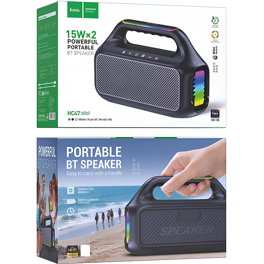 Портативна акустика Hoco HC47 – це компактний пристрій, призначений для відтворення аудіо в різних умовах, включаючи домашнє використання, прогулянки та поїздки. Корпус виготовлений із міцного пластику та доповнений текстурованими вставками, які роблять менш помітними сліди експлуатації та підвищують стійкість до зовнішніх впливів. Вбудований акумулятор забезпечує роботу без постійного підключення до мережі, дозволяючи використовувати колонку автономно. Підтримка Bluetooth-з’єднання спрощує синхронізацію зі смартфонами, планшетами та іншими пристроями без використання кабелів. Також доступні альтернативні варіанти відтворення, такі як використання карт пам’яті та підключення через AUX-інтерфейс. Кнопки керування розміщені на корпусі, що забезпечує швидкий доступ до основних функцій без необхідності взаємодії з підключеним пристроєм. Конструкція передбачає зручність транспортування, завдяки чому колонку можна використовувати в різних місцях. Акустична система налаштована на стабільне та рівномірне відтворення звуку на стандартних рівнях гучності. Наявність вбудованого мікрофона дозволяє використовувати пристрій для дзвінків у режимі гучного зв’язку.