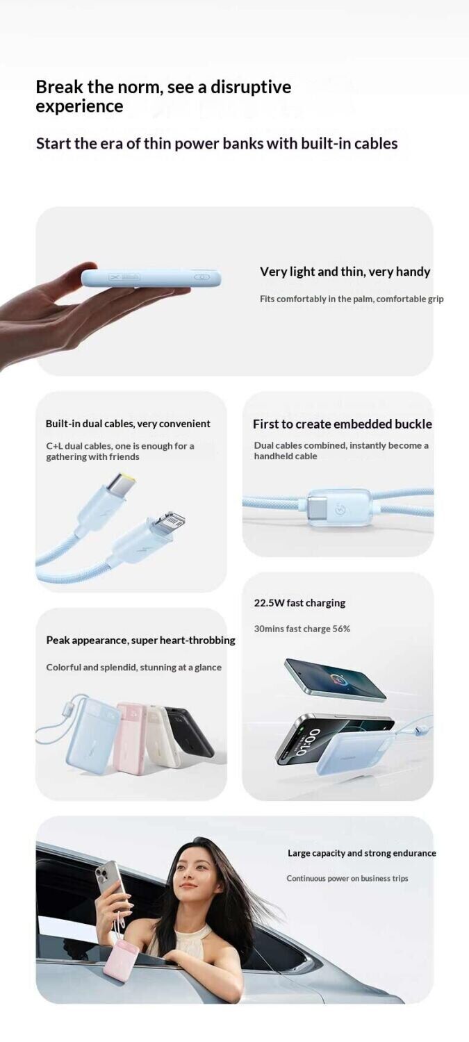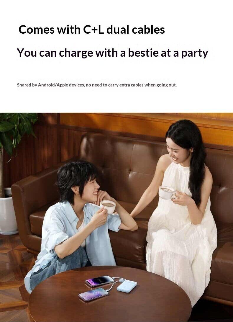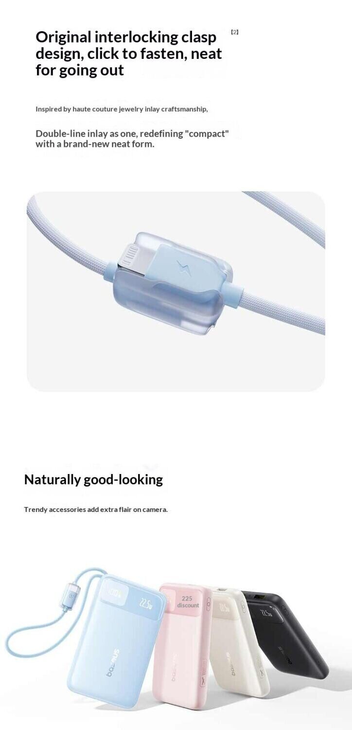 - Вбудовані кабелі USB-C і Lightning з міцним обплетенням;