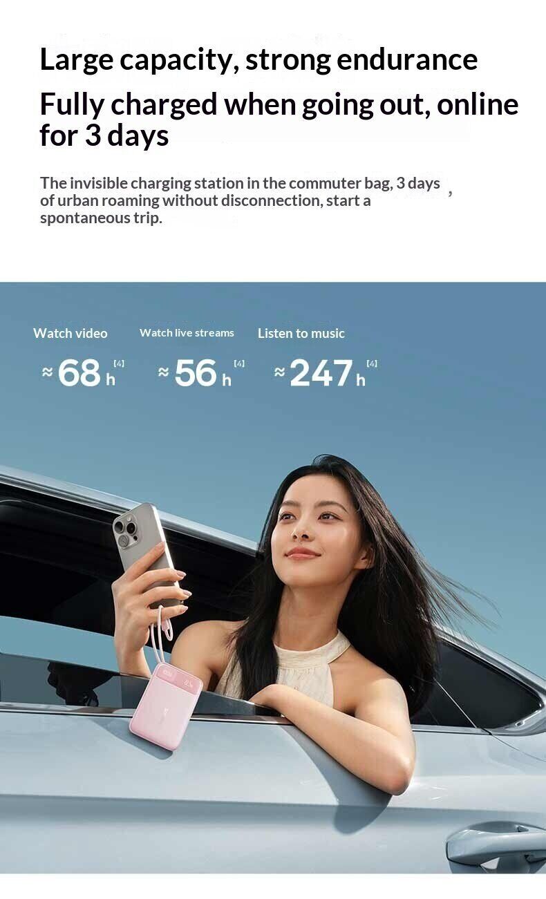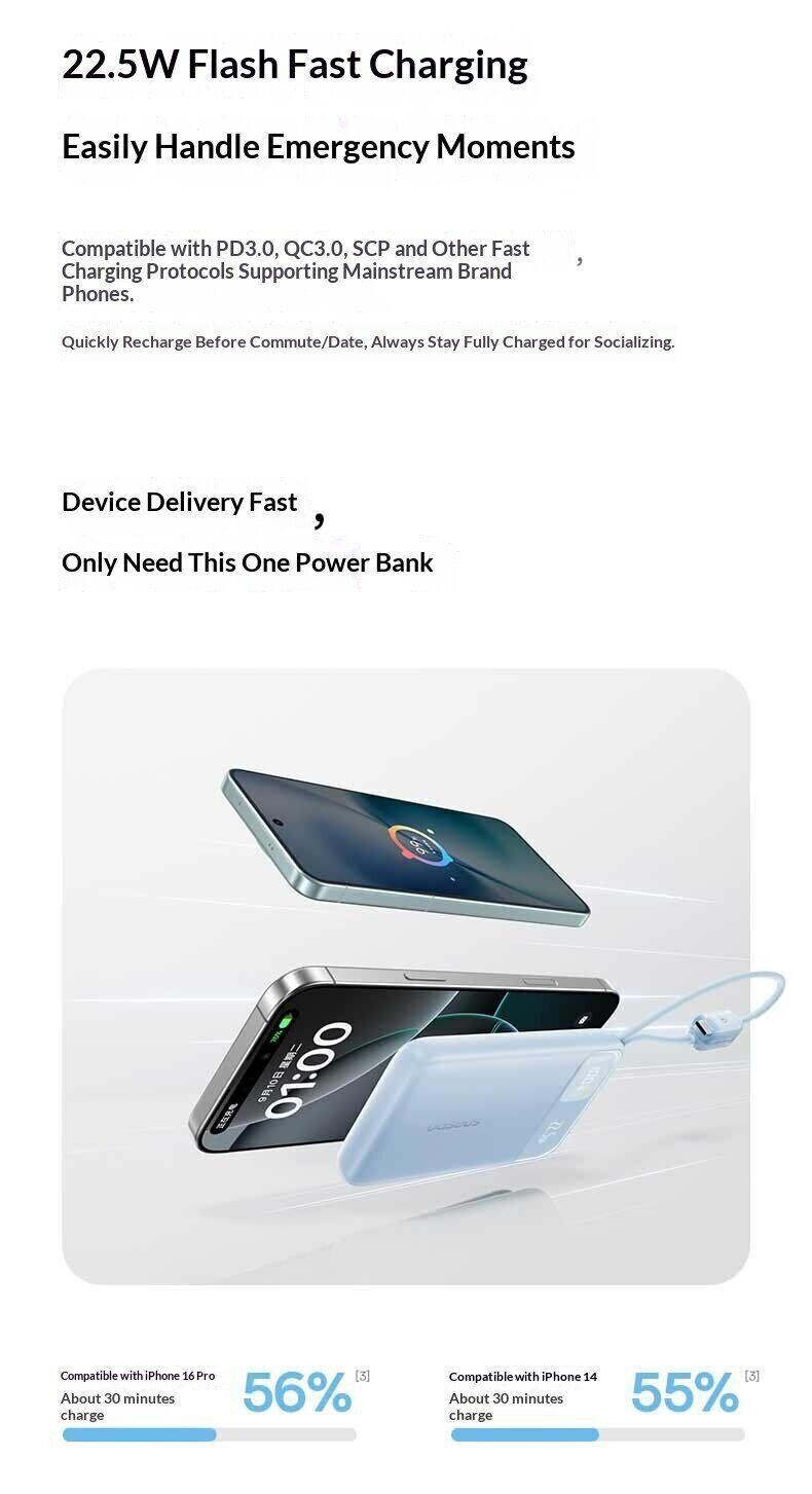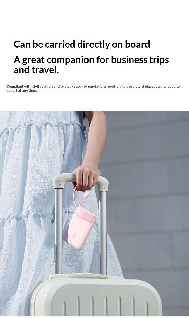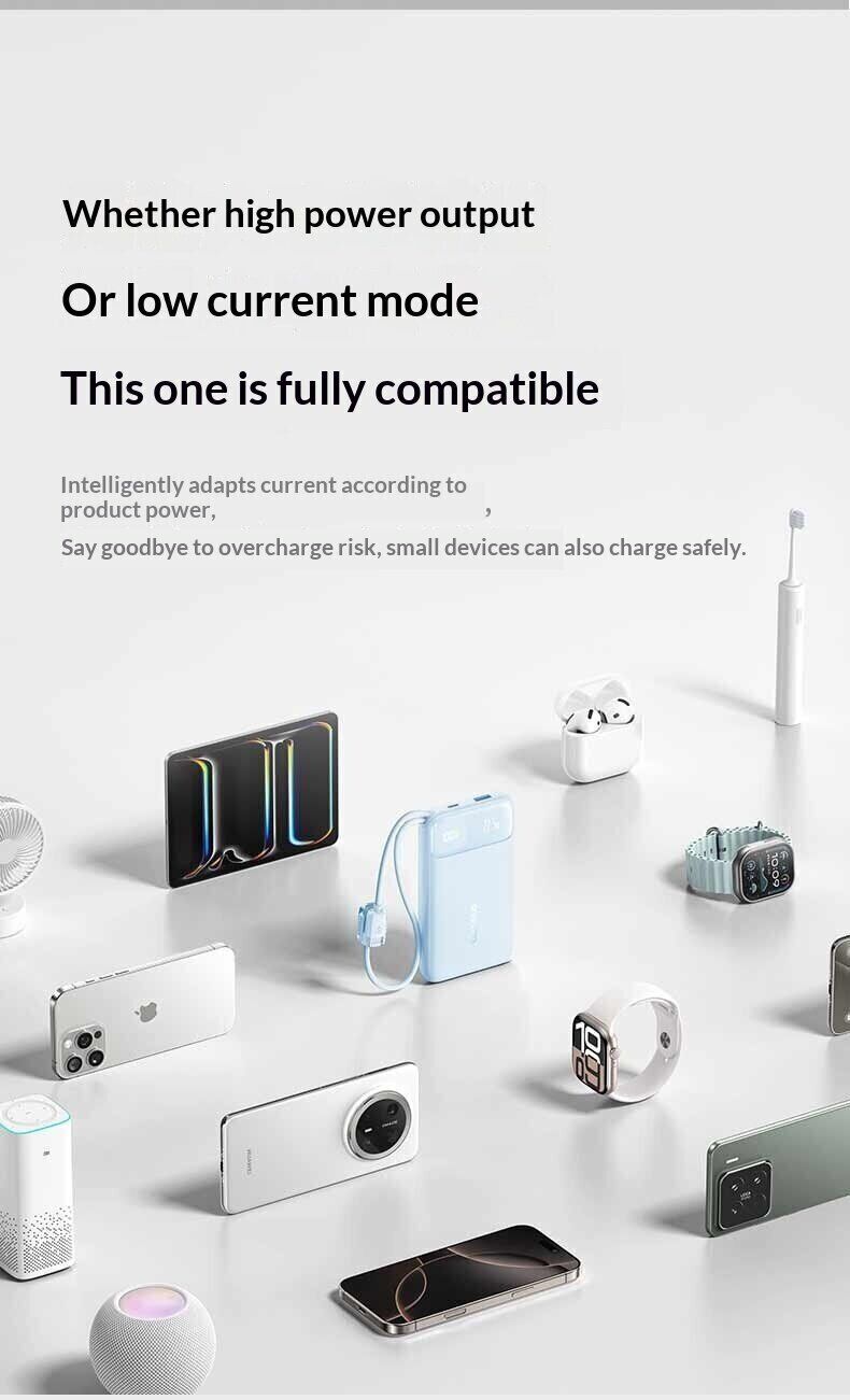 Зовнішній акумулятор Baseus EnerFill FC11 22,5 Вт (20000 мА·год) — це універсальне джерело живлення для щоденного використання, подорожей та роботи поза домом. Ємність 20000 мАг дозволяє багаторазово заряджати смартфони, планшети та інші пристрої, забезпечуючи тривалу автономність без доступу до розетки. Модель оснащена вбудованими кабелями USB-C і Lightning з міцним обплетенням, що позбавляє від необхідності носити додаткові дроти та спрощує використання. Підтримка швидкої зарядки до 22,5 Вт допомагає скоротити час поповнення енергії, а функція двосторонньої зарядки прискорює заряд самого акумулятора. Цифровий дисплей відображає рівень заряду у відсотках, дозволяючи точно контролювати залишок енергії. Компактний корпус робить пристрій зручним для перенесення, а вбудована система захисту забезпечує безпечну роботу.