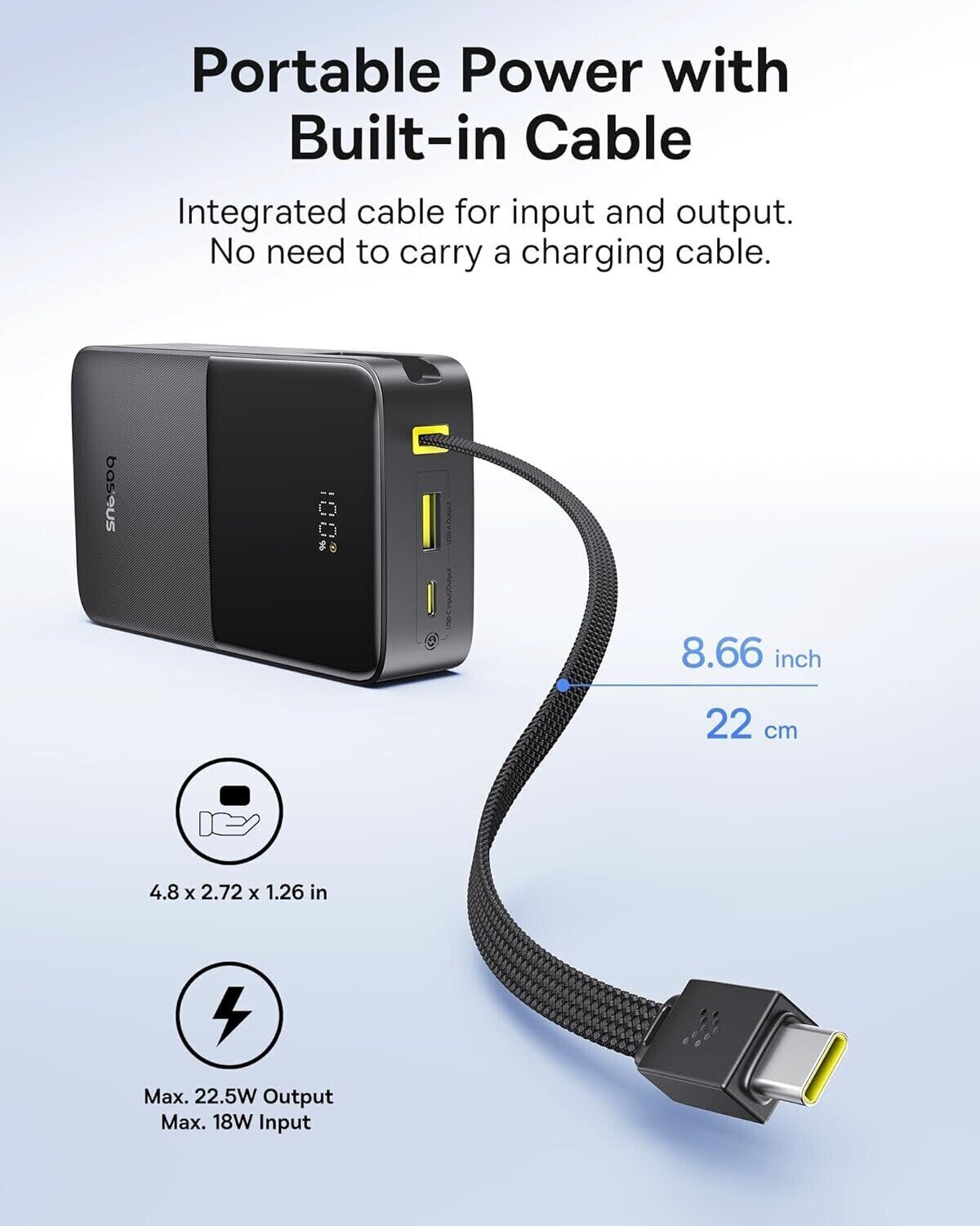- Вбудований кабель USB-C позбавляє необхідності носити додаткові дроти;