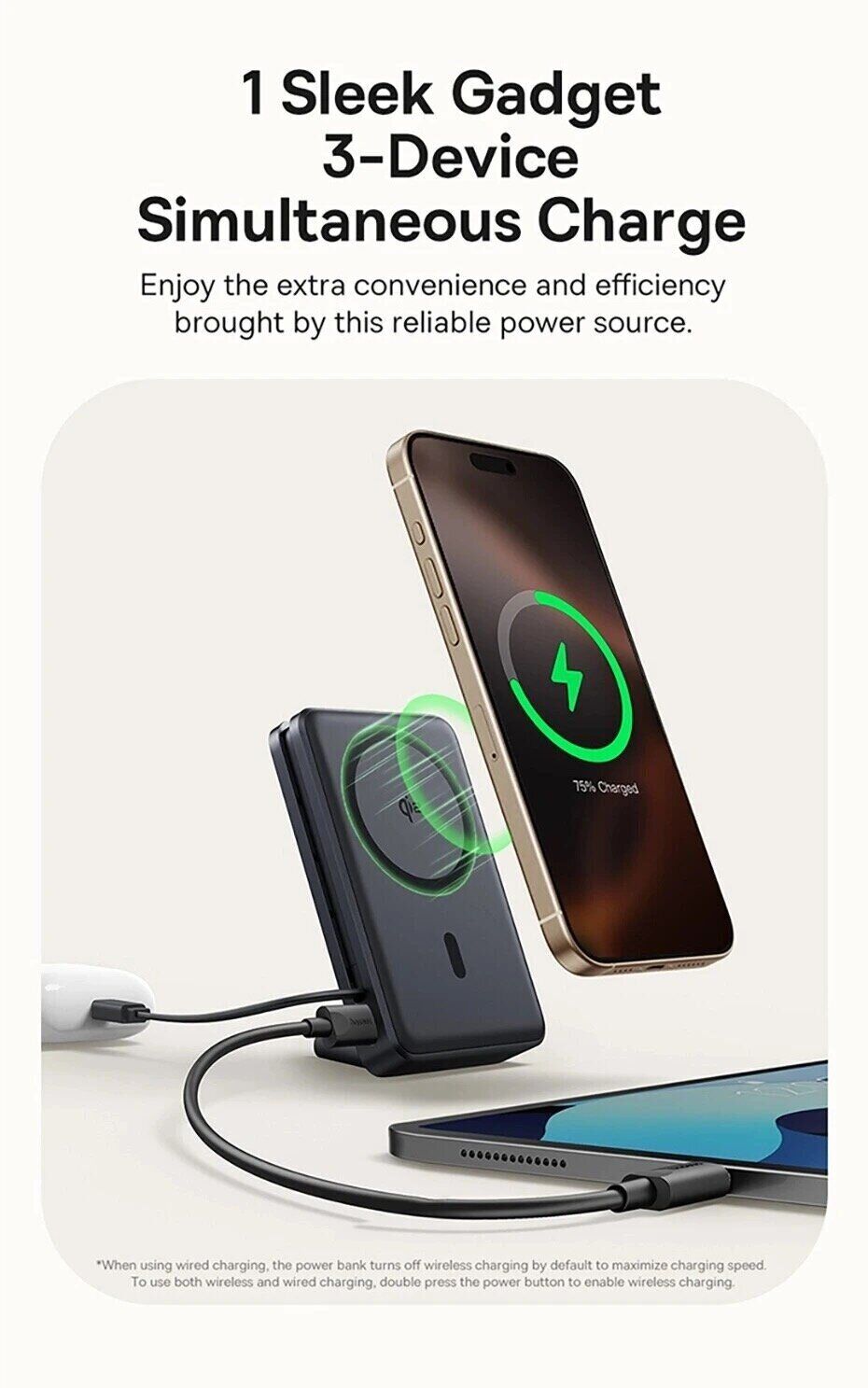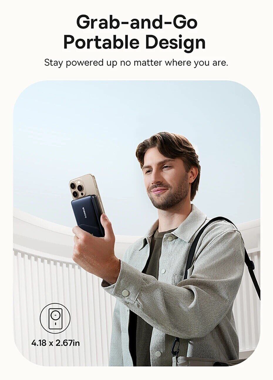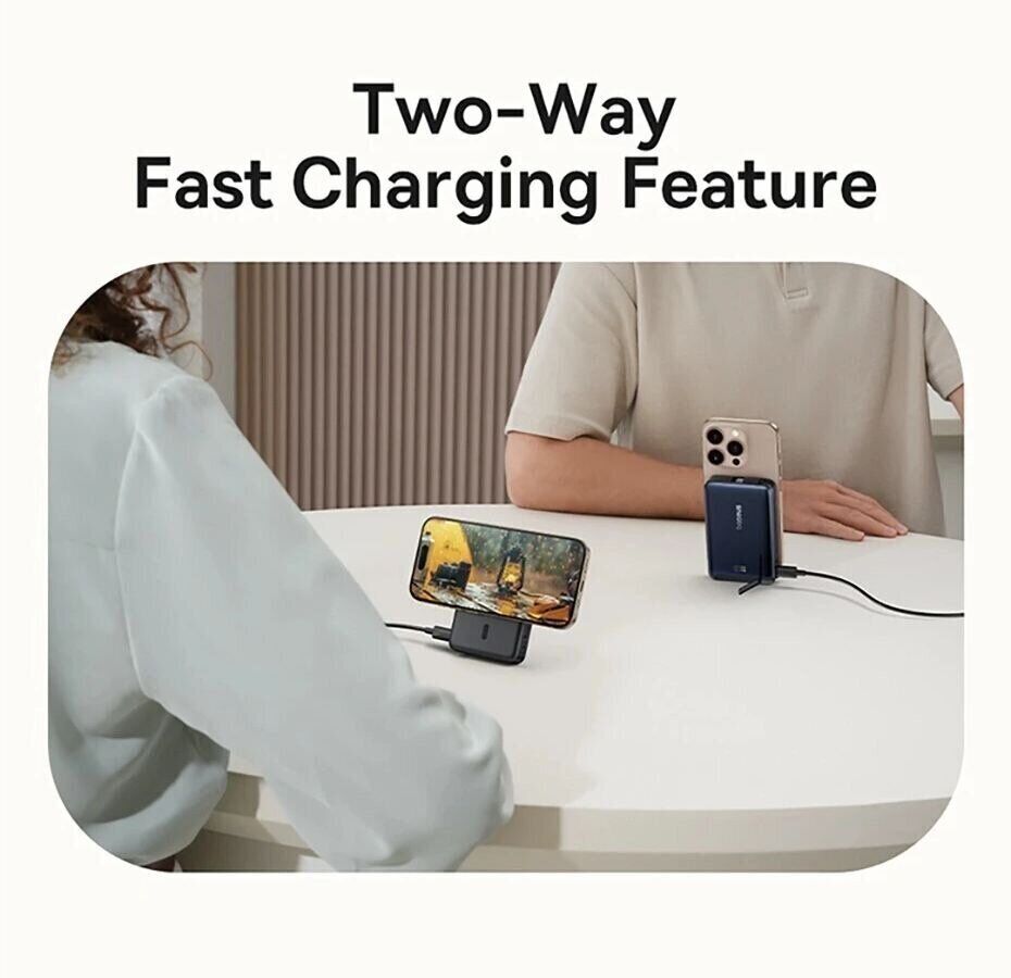 Зовнішній акумулятор Baseus Nomos Qi2 45W (10000mAh) + кабель Type-C (P10078800123-00) – це сучасне універсальне рішення для швидкої та зручної підзарядки мобільних пристроїв у будь-яких умовах. Компактний корпус поєднує ємність 10000 мАг і підтримку актуальних технологій, тому модель однаково зручна для повсякденних завдань і подорожей. Акумулятор підтримує дротову і бездротову зарядку, дозволяючи підзаряджати відразу кілька пристроїв. Складна підставка допомагає комфортно розмістити смартфон на столі для роботи або перегляду контенту, а LCD-дисплей наочно показує рівень заряду і поточний статус роботи. Міцний пластиковий корпус стійкий до повсякденного зносу і довго зберігає акуратний зовнішній вигляд.