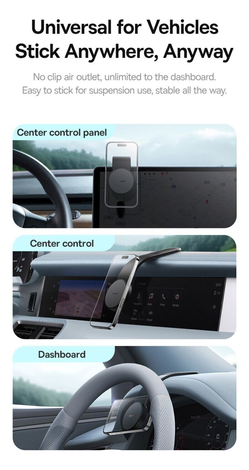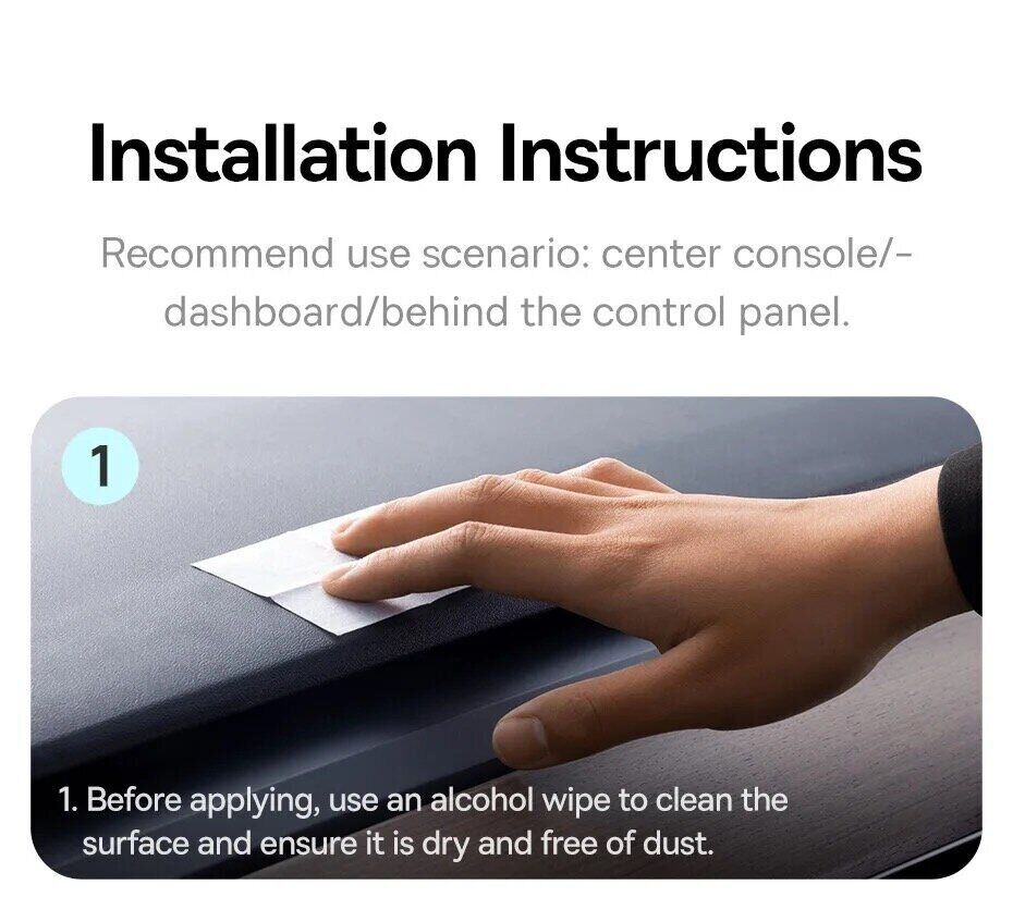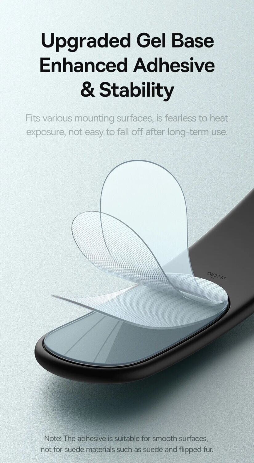 - Універсальне кріплення без затискачів підходить для установки на приладовій панелі, центральній консолі або інших гладких поверхнях салону;