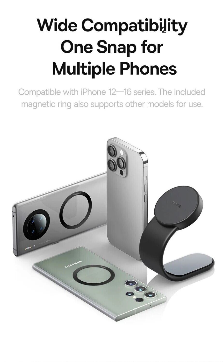 - Підходить для більшості моделей смартфонів, включаючи пристрої з підтримкою MagSafe і магнітними кільцями;