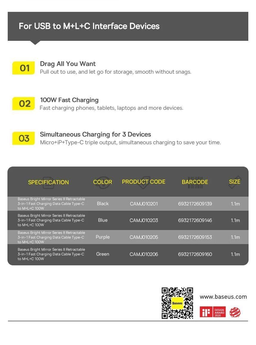 Кабель Baseus Bright Mirror 2 Series 3-in-1 Type-C до MicroUSB+Lightning+Type-C (100W, 1.1m) CAMJ010201 – це універсальний та багатофункціональний кабель, що забезпечує високу ефективність заряджання та зручність використання. Довжина кабелю 1.1 метра зі зручною системою зберігання типу "рулетка" дозволяє уникнути плутанини та забезпечує легкість транспортування. Включає три типи роз'ємів: MicroUSB, Lightning і Type-C, що робить його сумісним з широким спектром пристроїв. Максимальна потужність для Type-C досягає 100 Вт, що дозволяє заряджати навіть ноутбуки, тоді як для Lightning і MicroUSB вона становить 20 Вт і 10 Вт відповідно. Підтримка передачі даних доступна лише для кабелю Lightning.