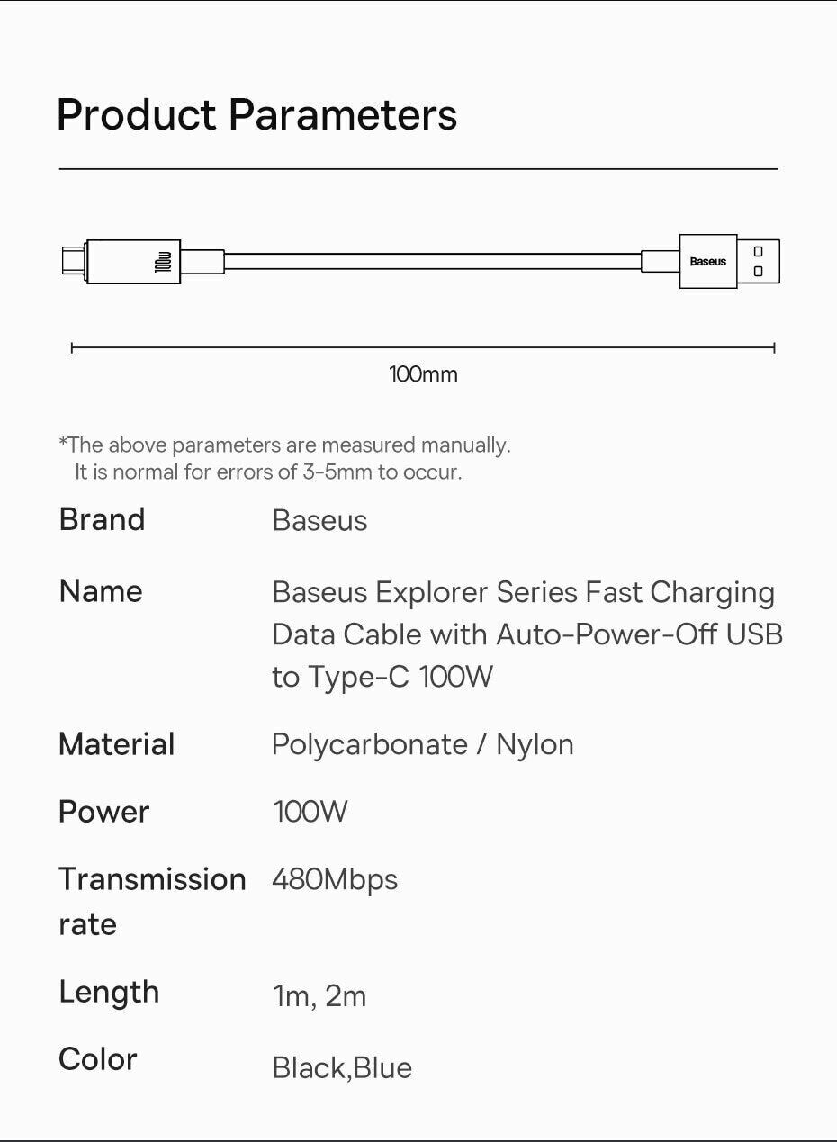 Особливості кабелю Baseus Explorer Series USB to Type-C (100W, 1m) CATS000201: