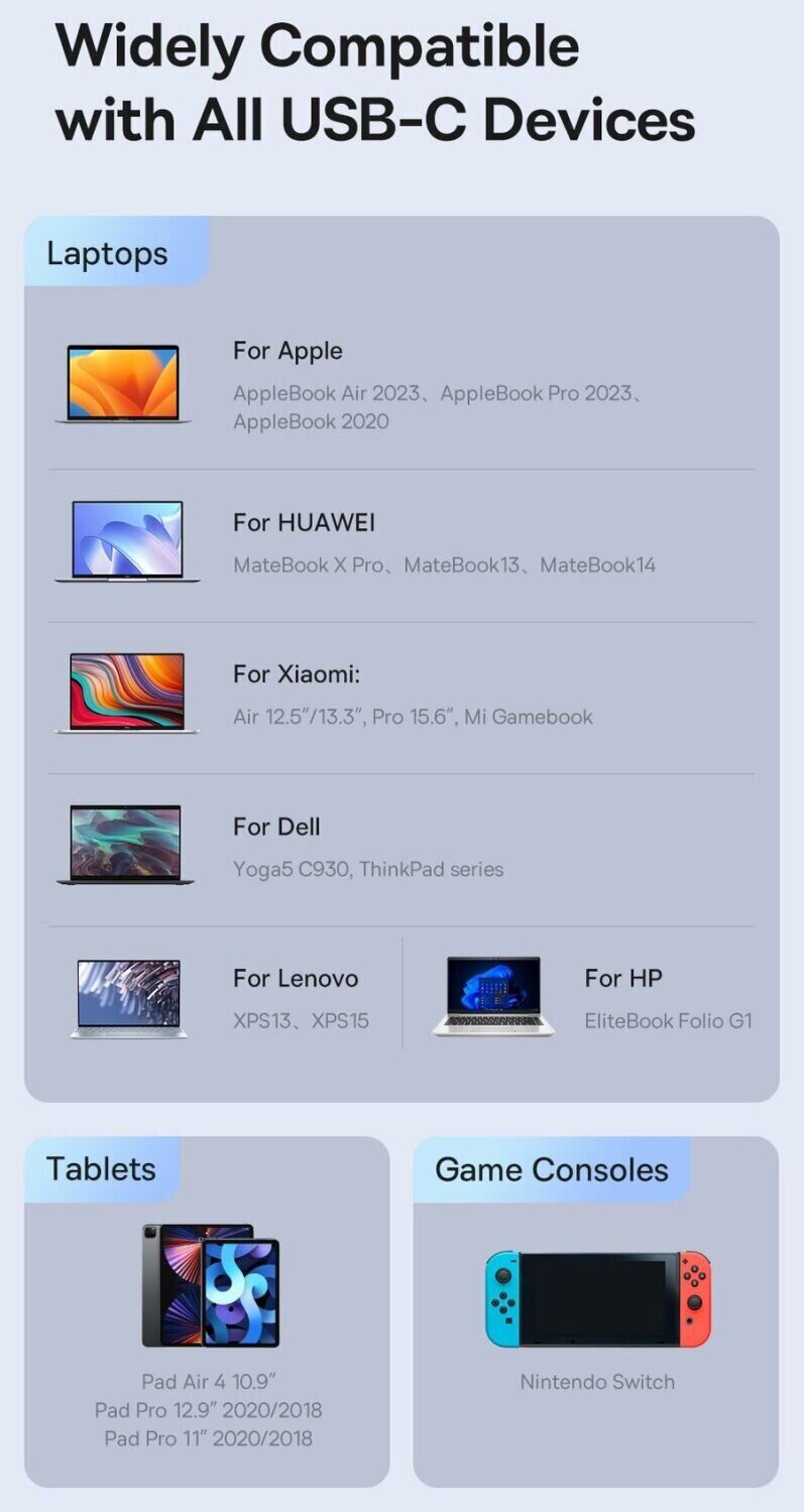 - Підходить для пристроїв останнього покоління, включно зі смартфонами, ноутбуками, планшетами та ігровими консолями;