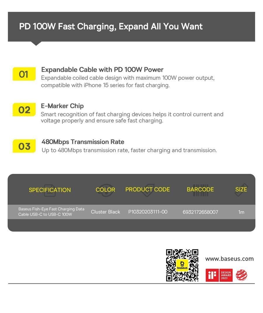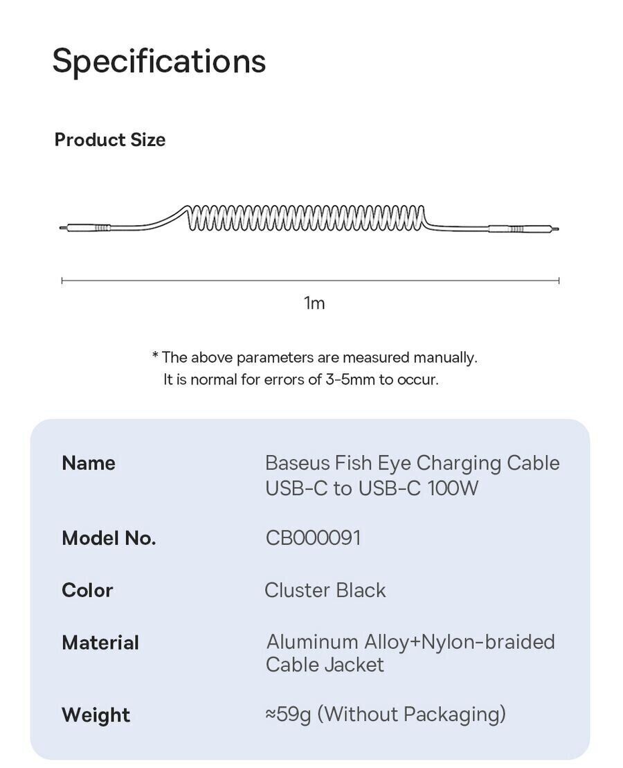 Особливості кабелю Baseus Fish-Eye Type-C to Type-C (100W, 1m) P10320203111-00: