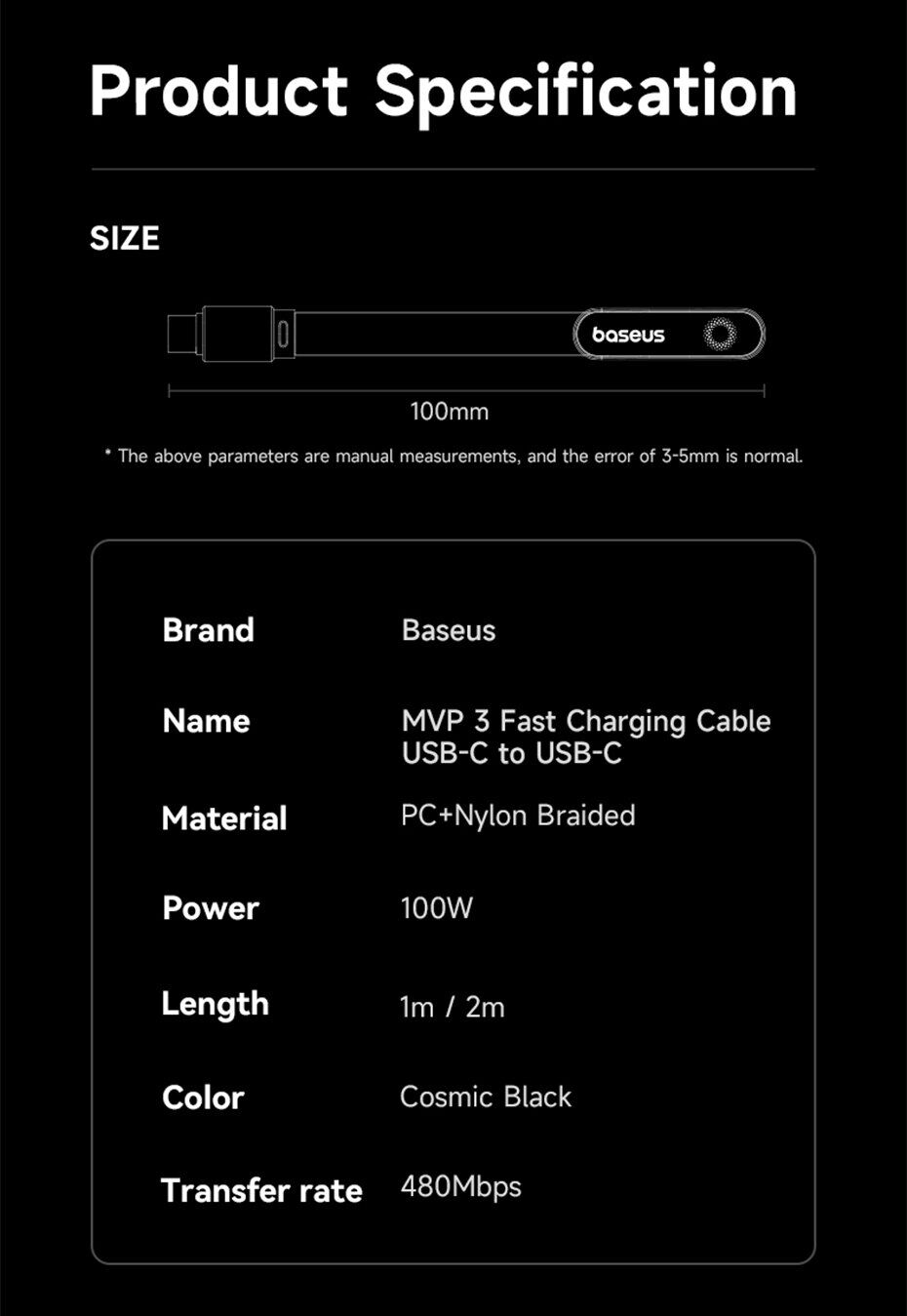 Особливості кабелю Baseus MVP3 Type-C to Type-C (100W, 1m):