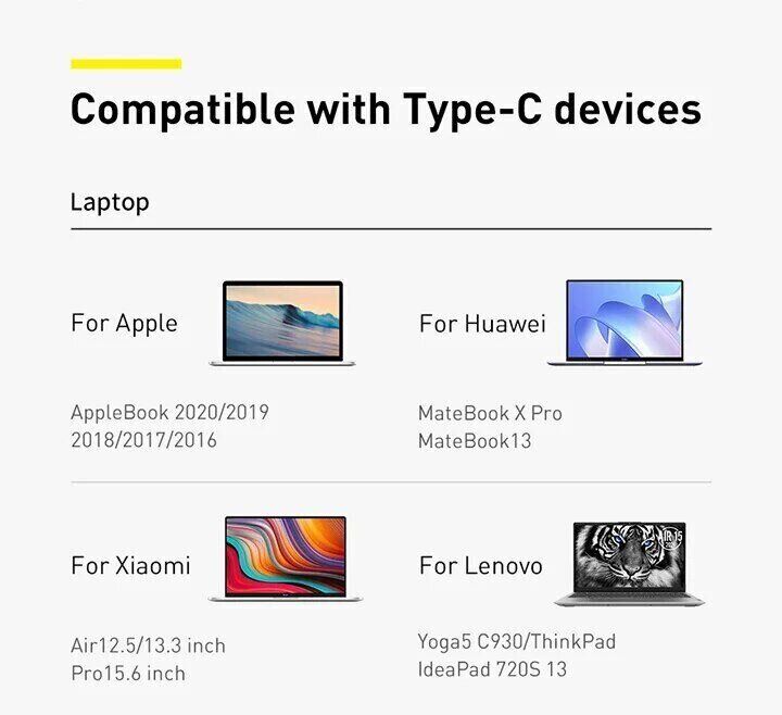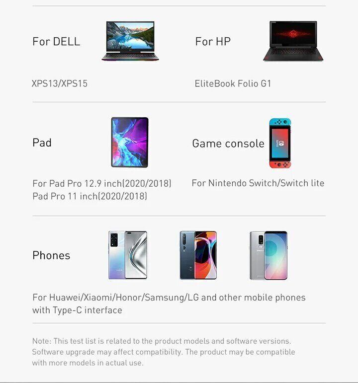 - Підходить для широкого спектру пристроїв із портом Type-C, від смартфонів до ноутбуків;