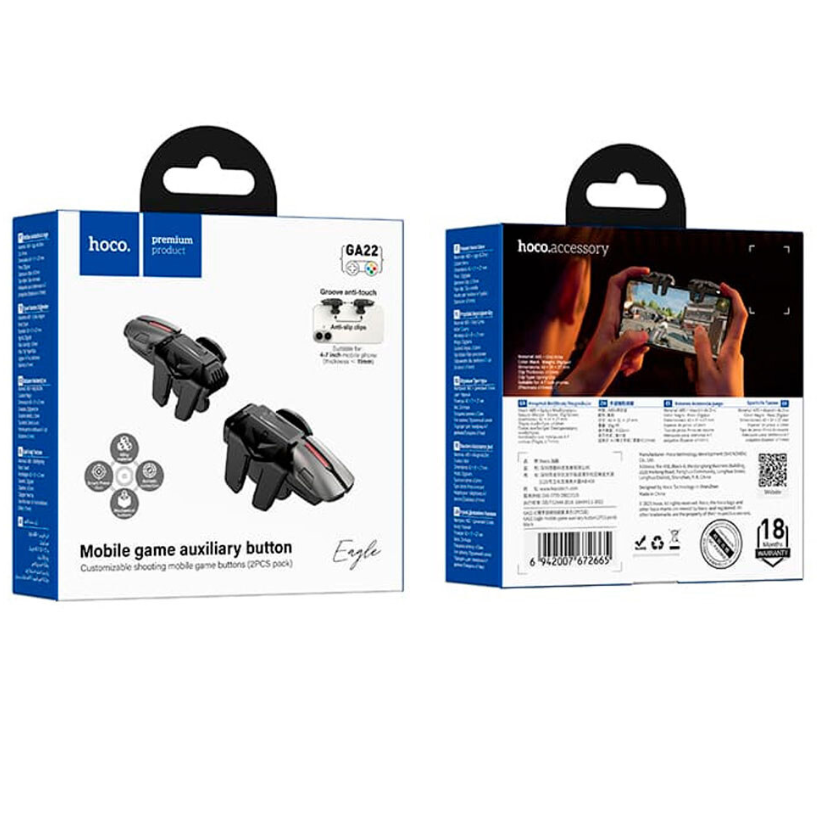 Ігровий контролер Hoco GA22 – це додатковий аксесуар для смартфона, який допомагає спростити керування в мобільних іграх. Він кріпиться до корпусу пристрою за допомогою затискного механізму та не потребує підключення до живлення або синхронізації. Кнопки механічного типу взаємодіють із екраном, дозволяючи виконувати ігрові дії без перекриття області дисплея пальцями. Контролер підходить для смартфонів із діагоналлю від 4 до 7 дюймів і товщиною до 11 мм. Корпус виготовлений із ABS-пластику та доповнений металевими елементами, що забезпечує стабільність конструкції. Компактна форма дозволяє зручно зберігати аксесуар і використовувати його під час поїздок. Дві кнопки дають можливість задіяти додаткові дії в грі та перерозподілити керування. Модель підходить для мобільних ігор із налаштовуваними елементами керування, включаючи шутери та екшн-ігри.