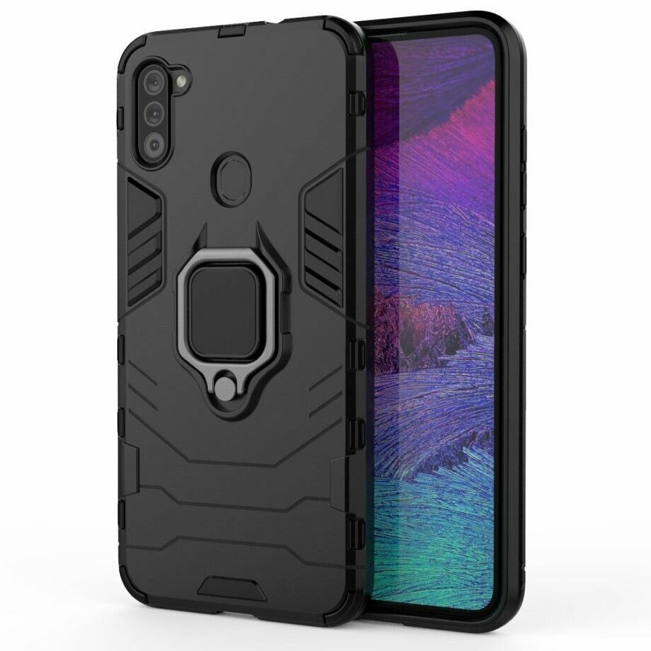 Чохол Deexe Hybrid Case - це оптимальне рішення для безпеки Samsung Galaxy A11 (A115). Він грамотно поєднує в собі високі захисні властивості, стильний сучасний дизайн і доступну вартість. Конструкція складається з комбінації міцного пластику та еластичного силікону (TPU), що зумовлює відмінні амортизаційні якості та дозволяє пом'якшувати удар в разі падіння на підлогу. Зовні чохол має приємну на дотик рифлену поверхню, яка перешкоджає ковзанню в руці та покрашує хват. Ззаду на спинці розміщено спеціальне кільце-тримач, за яке смартфон можна підвісити на пальці, а відкинувши - отримати зручну підставку.