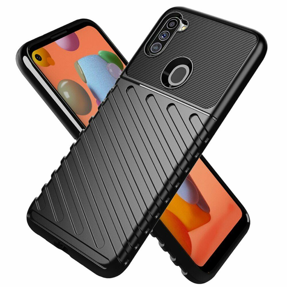 Чохол-накладка Deexe Thunder Series грамотно поєднує в собі компактні розміри, стильний сучасний дизайн і відмінні захисні властивості. Основним матеріалом тут виступає щільний термополіуретан (TPU), що довго не втрачає свій первозданний вигляд та здатний добре пом'якшити удар при падінні з висоти, оберігаючи корпус Samsung Galaxy A11 (A115) не тільки від подряпин, але й від тріщин. Чохол має спеціальну форму і рифлену фактуру поверхні, які не тільки додають оригінальності його зовнішньому вигляду, але й покращують хват в долоні. В конструкції передбачені необхідні отвори для камери та портів, клавіші ж прикриваються м'якими, чутливими до натиснення дублікаторами, тому використовувати смартфон буде так само зручно, як і раніше.