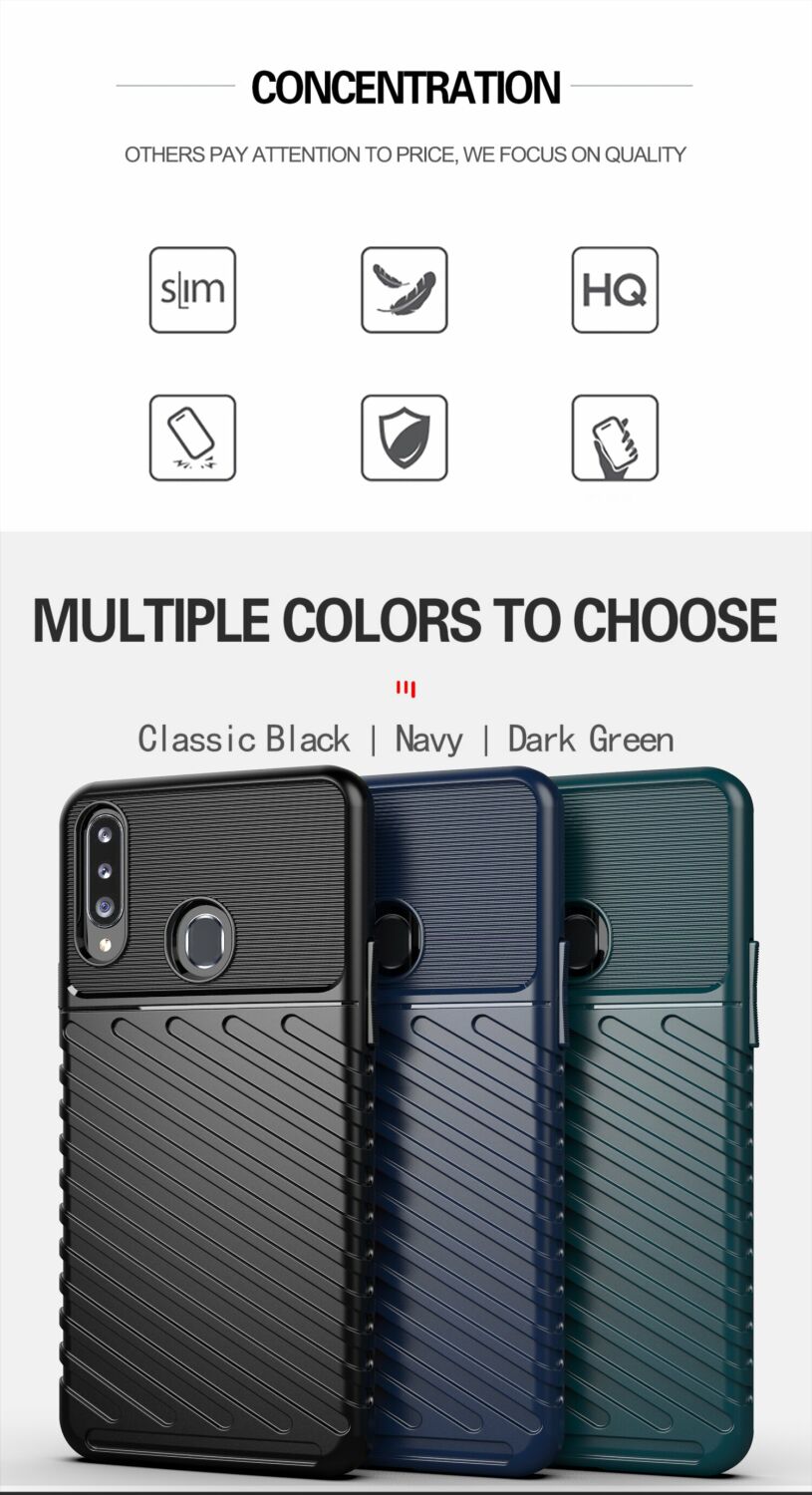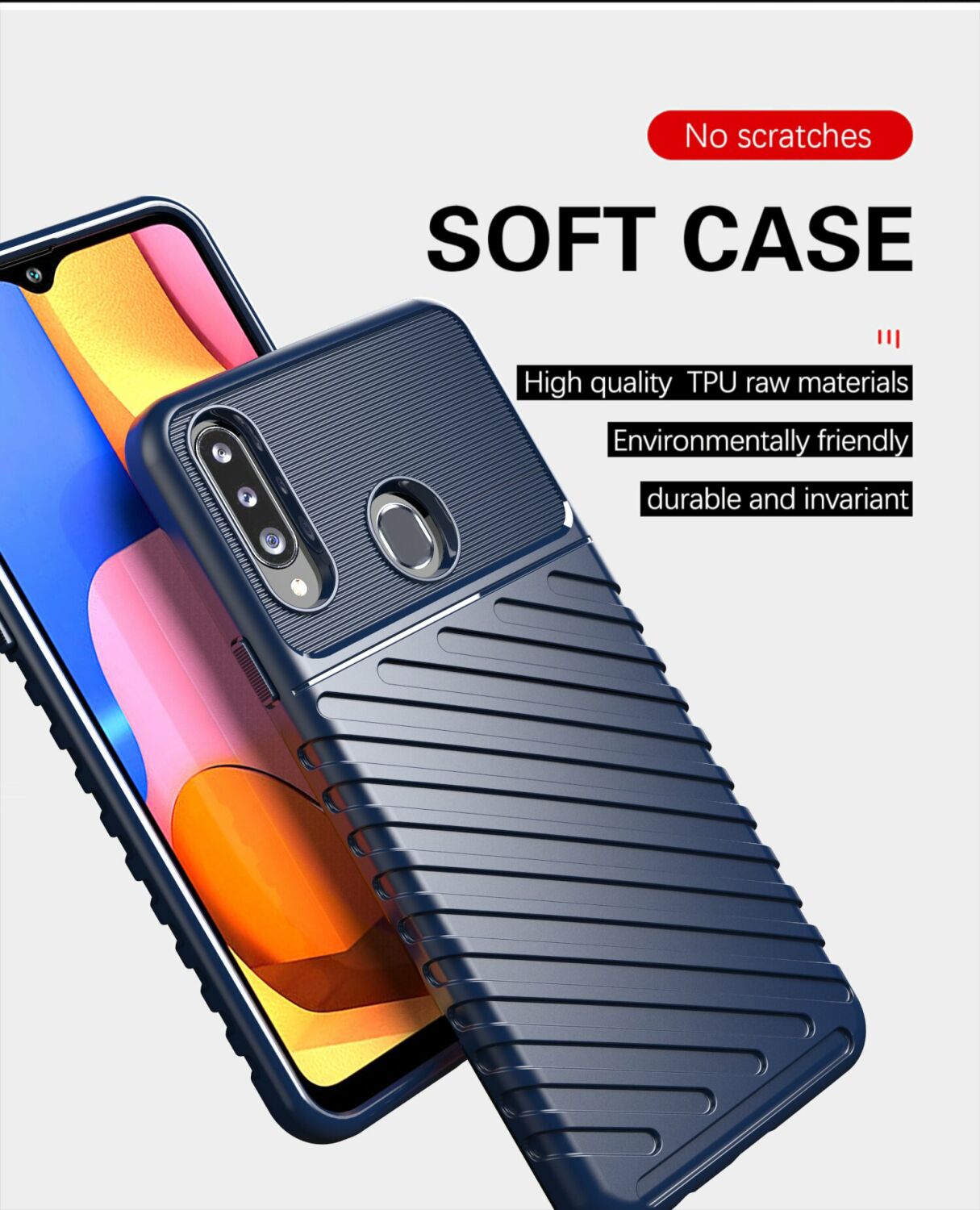 Чохол-накладка Deexe Thunder Series грамотно поєднує в собі компактні розміри, стильний сучасний дизайн і відмінні захисні властивості. Основним матеріалом тут виступає щільний термополіуретан (TPU), що довго не втрачає свій первозданний вигляд та здатний добре пом'якшити удар при падінні з висоти, оберігаючи корпус Samsung Galaxy A20s (A207) не тільки від подряпин, але й від тріщин. Чохол має спеціальну форму і рифлену фактуру поверхні, які не тільки додають оригінальності його зовнішньому вигляду, але й покращують хват в долоні. В конструкції передбачені необхідні отвори для камери та портів, клавіші ж прикриваються м'якими, чутливими до натиснення дублікаторами, тому використовувати смартфон буде так само зручно, як і раніше.