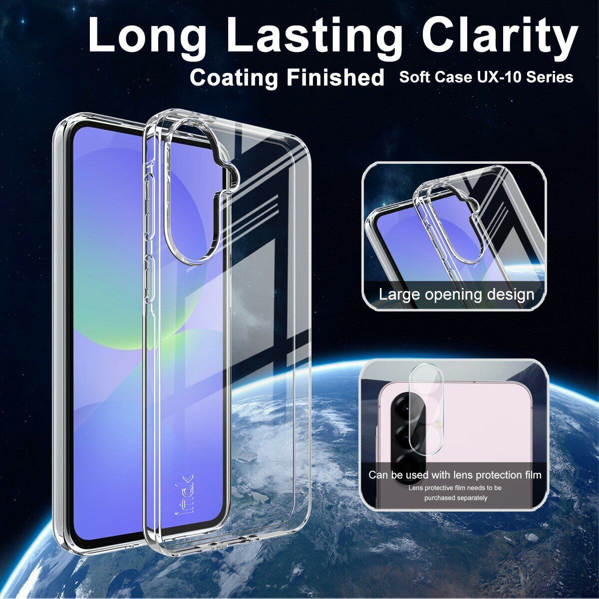 UX-10 Series – це повністю прозорий чохол від компанії IMAK, який забезпечить відмінний захист корпусу Samsung Galaxy A37 (A376) від бруду та пошкоджень, не приховуючи його оригінальний дизайн. В якості матеріалу тут використано щільний термопластичний поліуретан (TPU), відомий хорошими амортизаційними характеристиками, що дозволяє ефективно справлятися з невеликими падіннями. Для портів та камери пристрою у конструкції передбачені необхідні отвори, тоді як клавіші будуть прикриті м'якими дублікаторами. У надітому стані чохол трохи виступає над площиною фронтальної панелі, утворюючи невеликий "захисний бортик", що дозволяє безпечно класти пристрій екраном вниз.