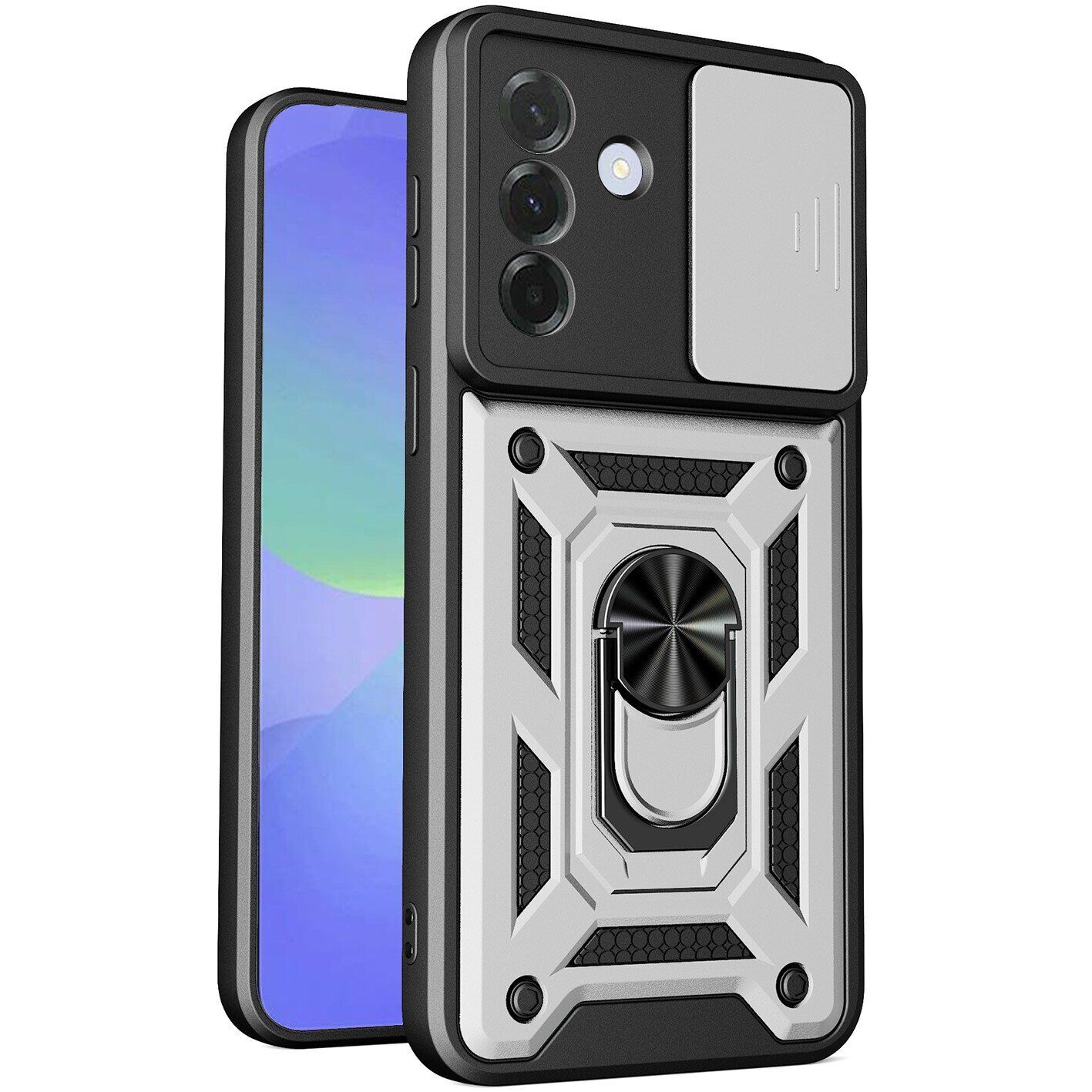 Захисний чохол Deexe Armor Shield ідеально поєднує стиль, захист і функціональність для Samsung Galaxy A37 (A376). Двошарова конструкція з силіконовим внутрішнім шаром і жорстким полікарбонатним панциром забезпечує підвищену стійкість до ударів. Рельєфна поверхня з матовим покриттям запобігає ковзанню і забрудненню. Вбудована заслінка дає змогу приховати камеру, захищаючи її від подряпин і пилу. Універсальне металеве кільце-тримач робить використання смартфона зручнішим, виконуючи роль підставки та магнітного кріплення для автомобіля.