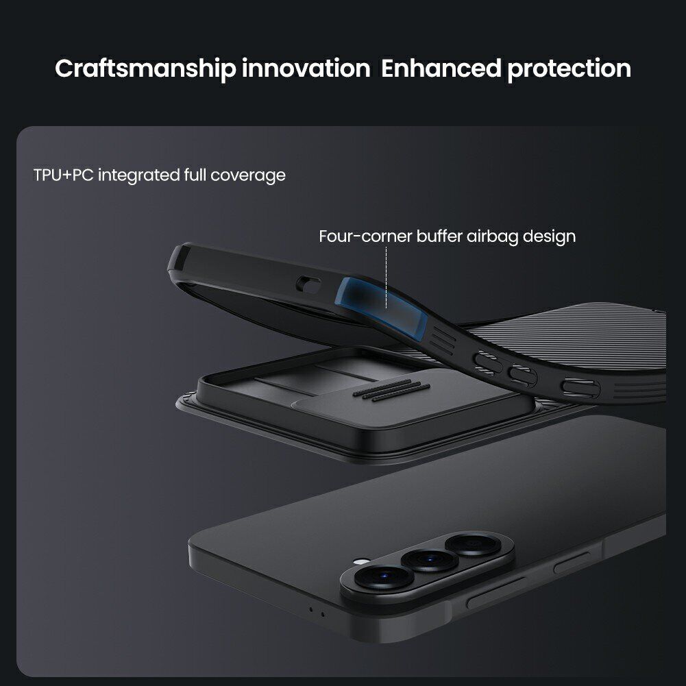 NILLKIN CamShield Pro Magnetic – це преміальний захисний чохол, виконаний у форм-факторі накладки, який забезпечить надійний захист Samsung Galaxy A57 (A576) від бруду, подряпин, тріщин і механічних пошкоджень. В його основі лежить двоскладова конструкція, що поєднує міцний полікарбонат і еластичний силікон (TPU). Таке поєднання покращує амортизаційні властивості, дозволяючи пристрою без наслідків витримувати невеликі падіння. На тильній панелі чохла передбачена рухома заслінка для камери, яка прикриває об'єктив, захищаючи його від подряпин і забруднень, коли він не використовується. Текстурована поверхня приємна на дотик, не збирає відбитки пальців і перешкоджає появі розводів. Конструкція аксесуара точно повторює форму корпусу пристрою, зберігаючи доступ до всіх портів і функціональних елементів. М'які дублікатори клавіш захищають кнопки від стирання, забезпечуючи комфортне натискання. Окремої уваги заслуговує підтримка технології MagSafe – у спинку чохла вбудований спеціальний магніт, що дає змогу швидко та безпечно під'єднувати сумісні бездротові зарядні пристрої та аксесуари.