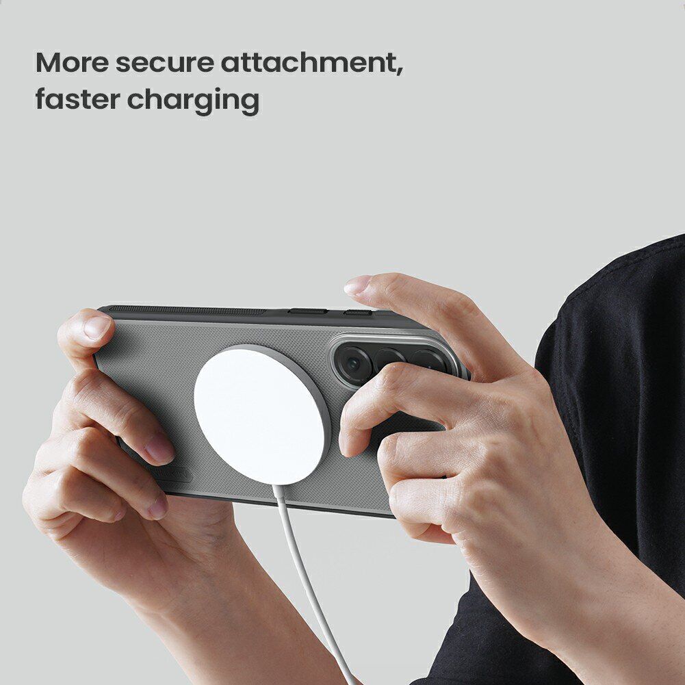 Захисний чохол NILLKIN Super Frosted Shield Pro Magnetic для Samsung Galaxy A57 (A576) виконаний в комбінованій конструкції з жорсткого полікарбонату і гнучкого TPU, що допомагає зберегти форму корпусу і одночасно пом'якшувати зовнішні впливи при випадкових ударах і контакті з твердими поверхнями. Задня панель має матову текстуру з точковим мікрорельєфом, завдяки якому поверхня менше схильна до появи відбитків пальців, пилу і дрібних потертостей, зберігаючи акуратний зовнішній вигляд пристрою. Бічні грані оброблені матовим UV-покриттям, що підвищує стійкість матеріалу до стирання і продовжує термін служби покриття. Вбудований магнітний модуль забезпечує сумісність з магнітними тримачами та іншими аксесуарами, дозволяючи швидко фіксувати смартфон без додаткових кріплень. Точна підгонка за формою пристрою не впливає на його габарити і зберігає зручність використання однією рукою. Передбачені акуратні вирізи під роз'єми, динаміки і камеру, а кнопки закриті окремими накладками для збереження відгуку.