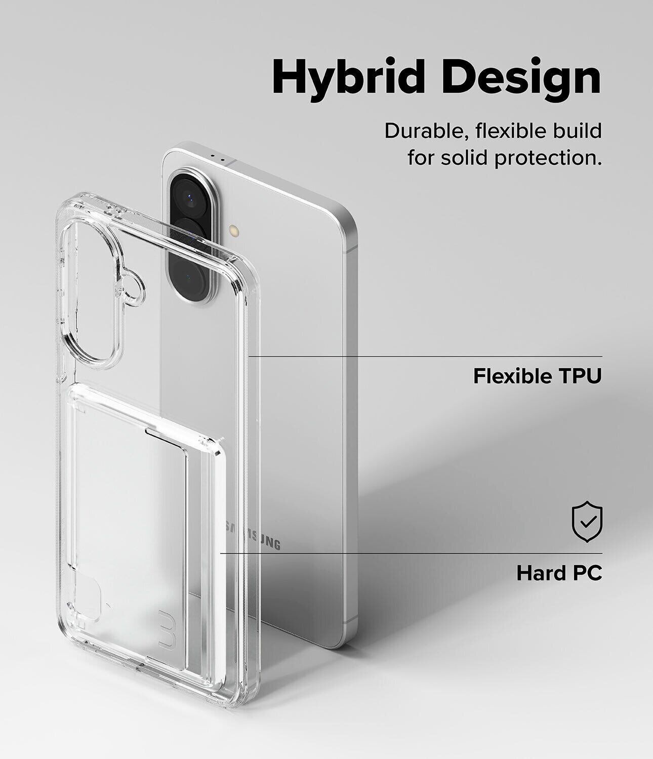 Захисний чохол Ringke Fusion Card для Samsung Galaxy A57 (A576) — це функціональний аксесуар, який поєднує прозорий дизайн і практичність вбудованого кардхолдера. Чохол виконаний у гібридній конструкції: міцна задня панель з полікарбонату захищає від подряпин і зберігає зовнішній вигляд смартфона, а еластична рамка з TPU ефективно амортизує удари при падіннях. Вбудований слот для карток дозволяє зберігати до трьох банківських або транспортних карток, забезпечуючи швидкий доступ без необхідності носити гаманець. Надійний внутрішній фіксатор запобігає випадковому випаданню вмісту, підвищуючи безпеку використання. Прозора поверхня підкреслює оригінальний дизайн пристрою, а наявність отворів для ремінця дозволяє додатково персоналізувати аксесуар і підвищити зручність носіння.