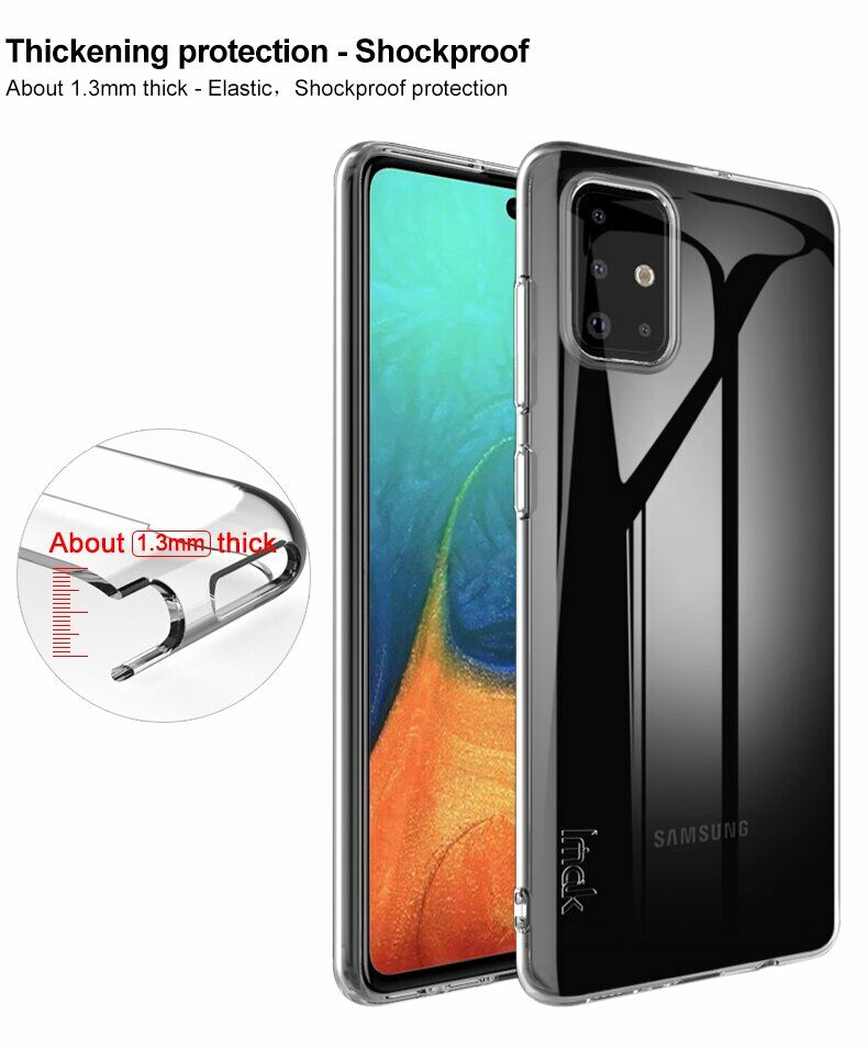 Чохол IMAK UX-5 – це мінімалістичне захисне рішення для Samsung Galaxy A71 (A715), що допоможе убезпечити поверхні корпусу від бруду та пошкоджень, майже не змінюючи його зовнішній вигляд. Матеріалом тут виступає прозорий силікон (TPU), стійкий до розриву і деформації, а також достатньо еластичний, щоб майже повністю "гасити" удар при падінні з невеликої висоти. Чохол відрізняється продуманою конструкцією, для портів і камери тут передбачені спеціальні вирізи, тоді як клавіші покриті м'якими дублікаторами, тому зручність роботи зі смартфоном не постраждає.
