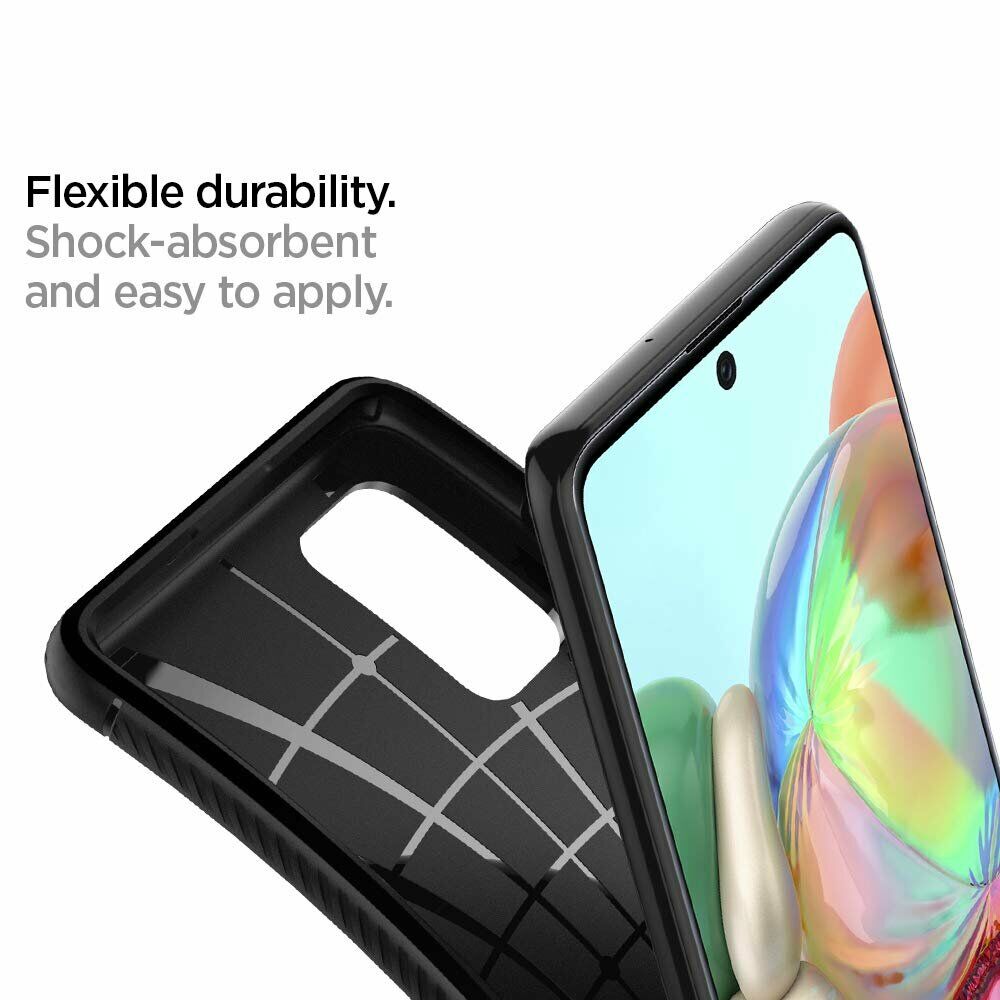 SGP Rugged Armor - це ультратонкий чохол-накладка преміум-класу, який надійно захистить корпус Samsung Galaxy A71 (A715) від бруду, жирних слідів і різного роду механічних пошкоджень. Він виготовлений з високоякісного термопластичного поліуретану (TPU) середньої жорсткості, що відрізняється високими амортизаційними властивостями та буде добре "гасити" удар у випадку падіння з висоти. Поверхня доповнена карбоновими вставками, які не тільки стильно виглядають, але й покращують хват в руці, знижуючи ймовірність впустити смартфон.