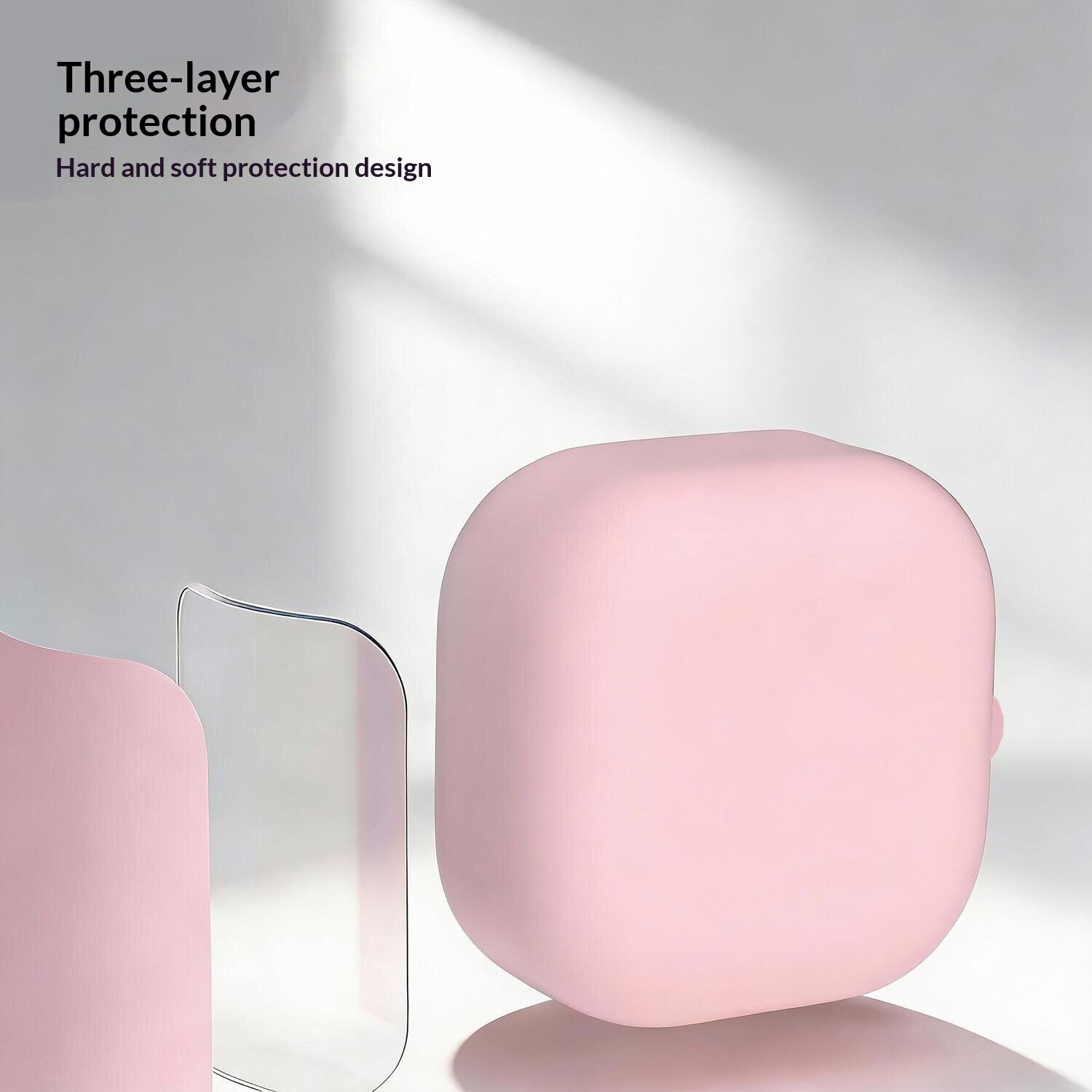 Захисний чохол Deexe Matte Case (FH) для Samsung Galaxy Buds 4 / Buds 4 Pro розроблений для збереження зовнішнього вигляду зарядного кейса та зменшення впливу повсякденних факторів, таких як дрібні подряпини, пил і випадкові падіння. Модель виготовлена з рідкого силікону з продуманою багатошаровою структурою: внутрішній шар додає жорсткості та допомагає зберігати форму, середній відповідає за амортизацію, а зовнішній забезпечує гнучкість і щільну посадку. Матова поверхня робить зовнішній вигляд більш охайним і зменшує помітність слідів від дотиків. Конструкція точно повторює форму кейса навушників, завдяки чому кришка відкривається без перешкод, а посадка залишається стабільною без зазорів. У нижній частині передбачено виріз під роз’єм заряджання, що дозволяє підключати кабель без зняття аксесуара, при цьому також підтримується бездротова зарядка. Окреме вікно для LED-індикатора зберігає можливість контролювати статус заряджання. Додатково передбачено металевий карабін, який дозволяє закріпити аксесуар на сумці, рюкзаку або інших предметах.