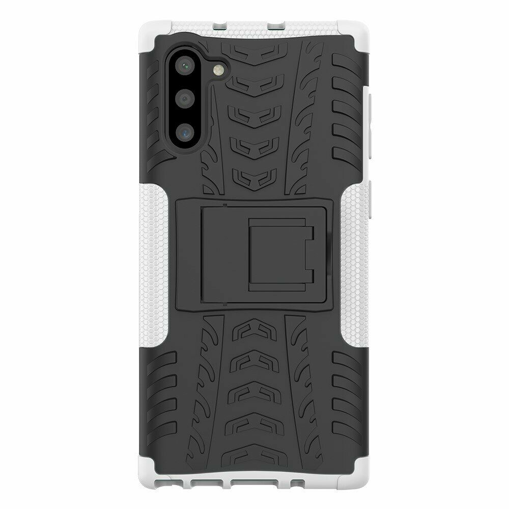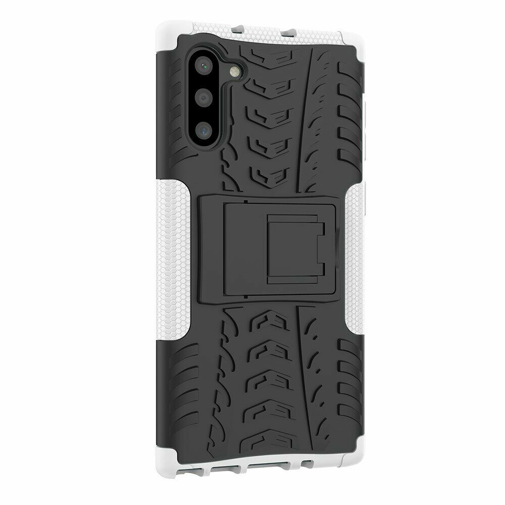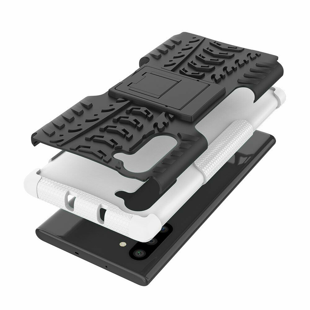 UniCase Hybrid X - це один з найнадійніших аксесуарів для Samsung Galaxy Note 10 (N970). Чохол складається з 2-х компонентів: щільної силіконової (TPU) накладки і міцного полікарбонатного панцира навколо неї. Завдяки такій конструкції, корпусу смартфона гарантується практично повна безпека при падіннях і сильних ударах. Зовнішня поверхня має спеціальну рифлену фактуру, яка не збирає на собі відбитки і покращує хват у руці. Виробник передбачив всі необхідні отвори для доступу до портів і камери смартфона, а також м'які пилозахисні дублікатори для клавіш. Також на спинці є невелика ніжка, відкинувши яку, чохол можна перетворити в зручну підставку, що полегшує перегляд відео і читання з екрану.