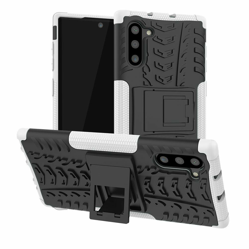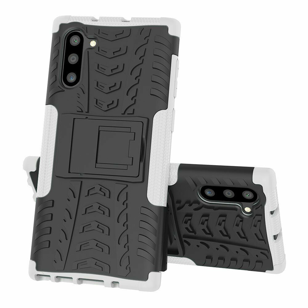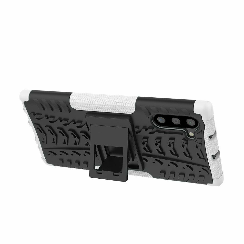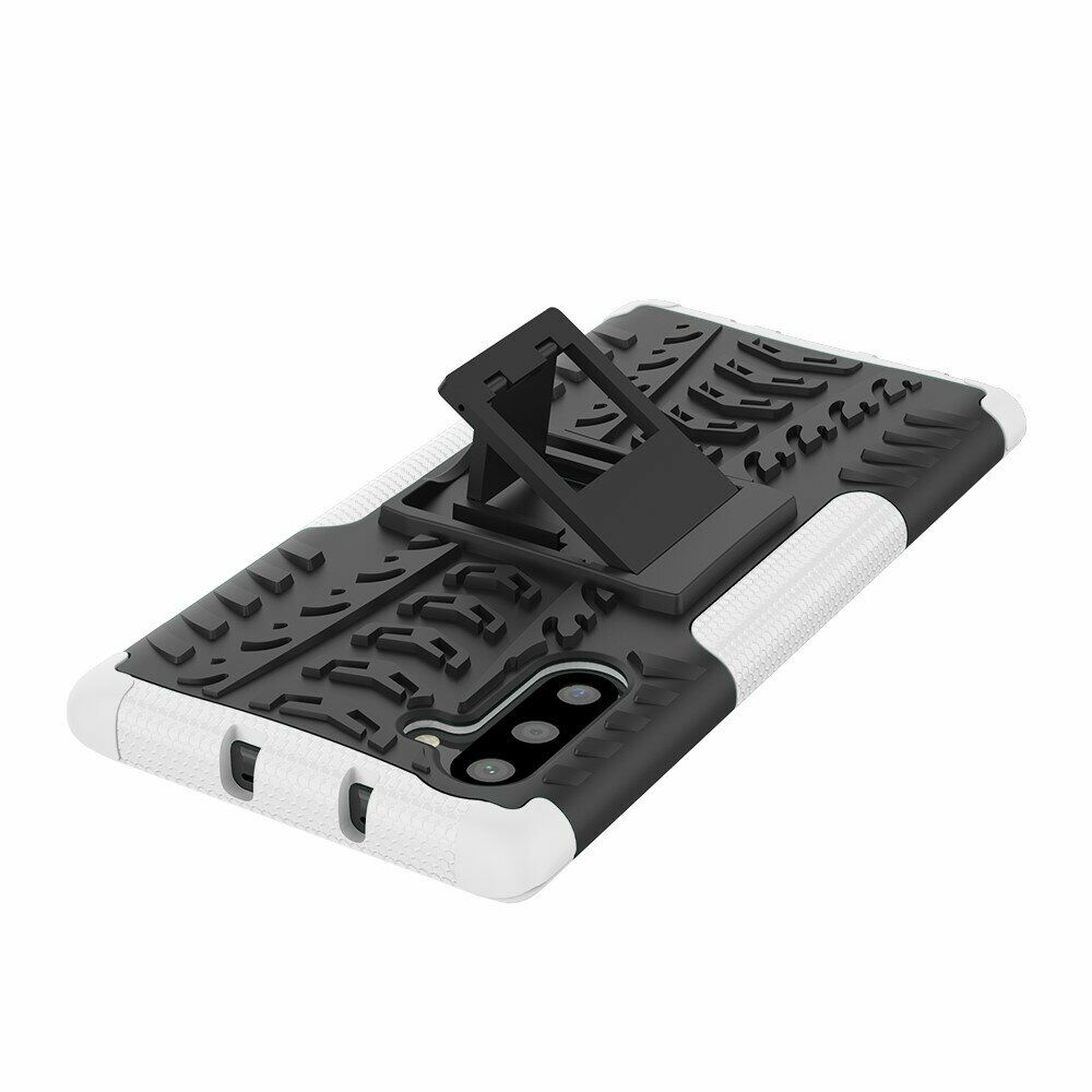 UniCase Hybrid X - це один з найнадійніших аксесуарів для Samsung Galaxy Note 10 (N970). Чохол складається з 2-х компонентів: щільної силіконової (TPU) накладки і міцного полікарбонатного панцира навколо неї. Завдяки такій конструкції, корпусу смартфона гарантується практично повна безпека при падіннях і сильних ударах. Зовнішня поверхня має спеціальну рифлену фактуру, яка не збирає на собі відбитки і покращує хват у руці. Виробник передбачив всі необхідні отвори для доступу до портів і камери смартфона, а також м'які пилозахисні дублікатори для клавіш. Також на спинці є невелика ніжка, відкинувши яку, чохол можна перетворити в зручну підставку, що полегшує перегляд відео і читання з екрану.