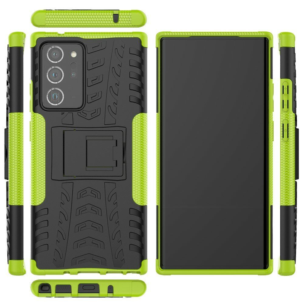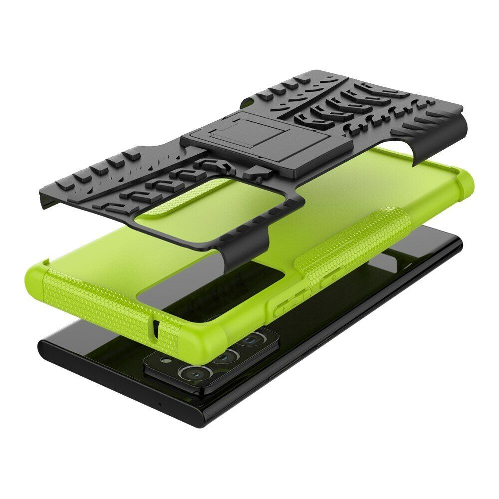 UniCase Hybrid X - це один з найнадійніших аксесуарів для Samsung Galaxy Note 20 Ultra (N985). Чохол складається з 2-х компонентів: щільної силіконової (TPU) накладки і міцного полікарбонатного панцира навколо неї. Завдяки такій конструкції, корпусу смартфона гарантується практично повна безпека при падіннях і сильних ударах. Зовнішня поверхня має спеціальну рифлену фактуру, яка не збирає на собі відбитки і покращує хват у руці. Виробник передбачив всі необхідні отвори для доступу до портів і камери смартфона, а також м'які пилозахисні дублікатори для клавіш. Також на спинці є невелика ніжка, відкинувши яку, чохол можна перетворити в зручну підставку, що полегшує перегляд відео і читання з екрану.