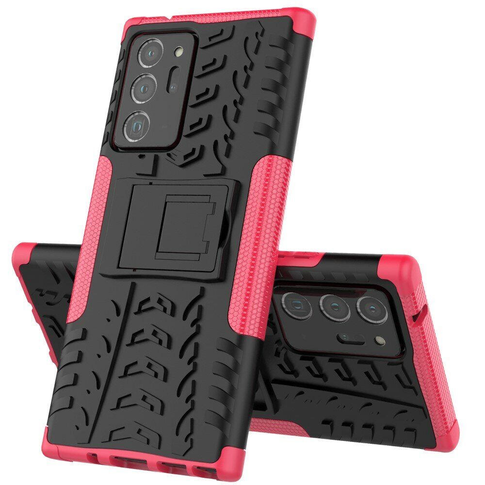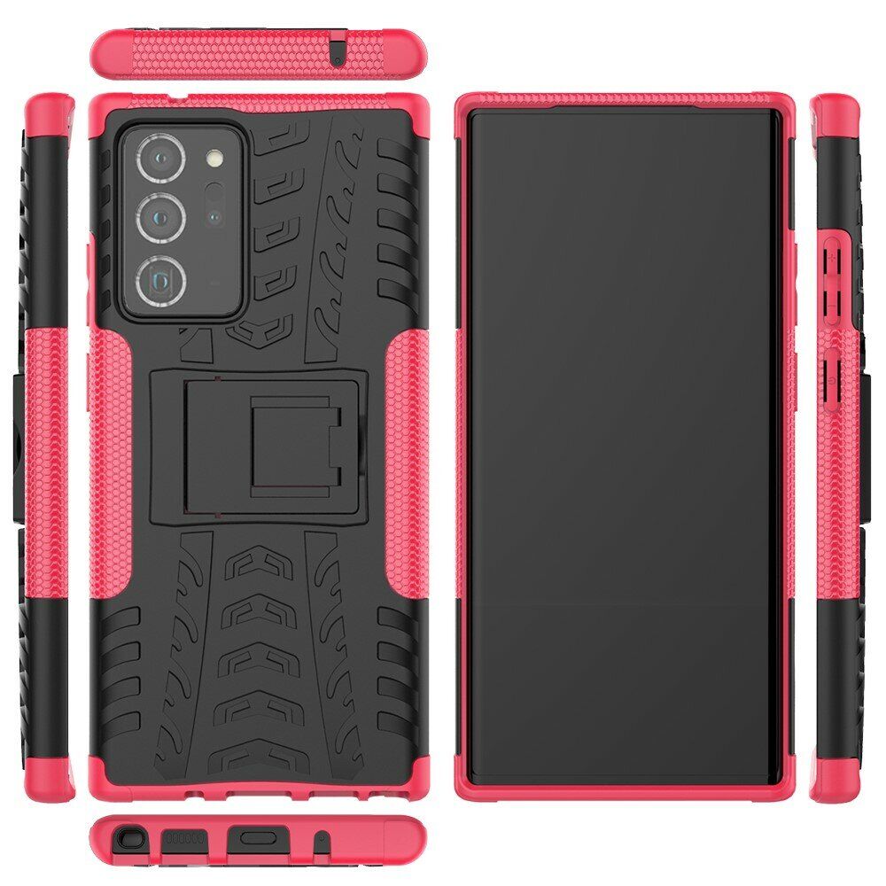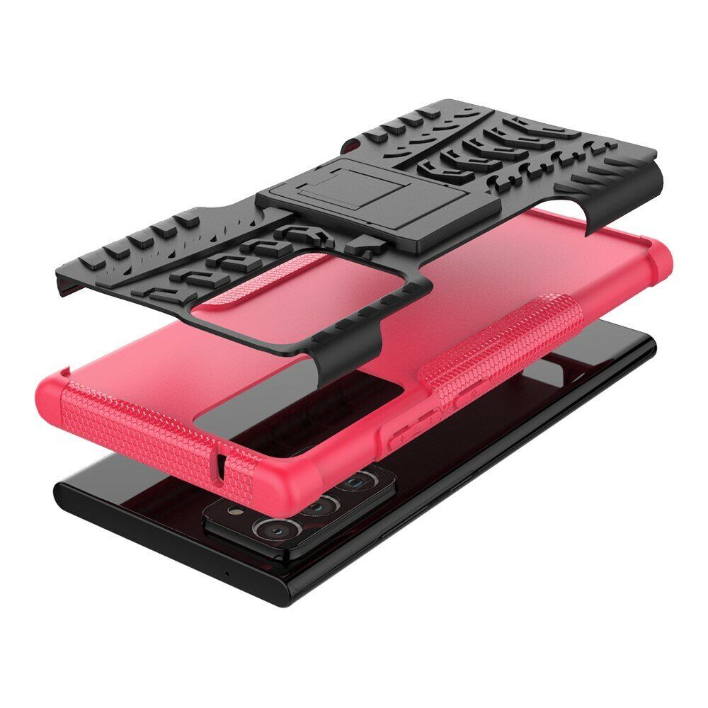 UniCase Hybrid X - це один з найнадійніших аксесуарів для Samsung Galaxy Note 20 Ultra (N985). Чохол складається з 2-х компонентів: щільної силіконової (TPU) накладки і міцного полікарбонатного панцира навколо неї. Завдяки такій конструкції, корпусу смартфона гарантується практично повна безпека при падіннях і сильних ударах. Зовнішня поверхня має спеціальну рифлену фактуру, яка не збирає на собі відбитки і покращує хват у руці. Виробник передбачив всі необхідні отвори для доступу до портів і камери смартфона, а також м'які пилозахисні дублікатори для клавіш. Також на спинці є невелика ніжка, відкинувши яку, чохол можна перетворити в зручну підставку, що полегшує перегляд відео і читання з екрану.