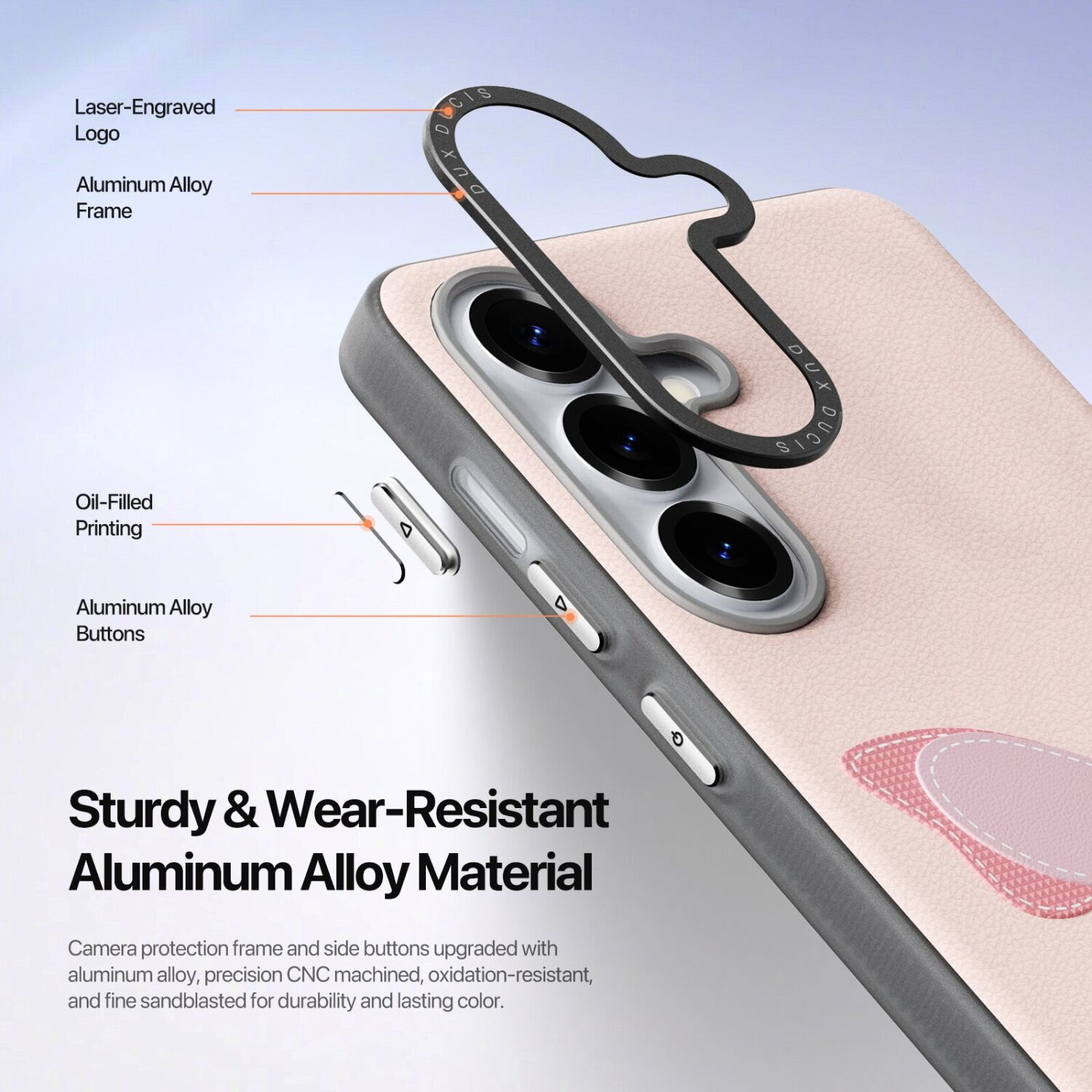 Захисний чохол DUX DUCIS Luvy Series для Samsung Galaxy S26 поєднує продуману конструкцію та акуратне оформлення корпусу смартфона, зберігаючи його зовнішній вигляд і функціональність. Основа моделі виготовлена з міцного полікарбонату, який підтримує форму аксесуара, а гнучка TPU-рамка пом’якшує вплив під час випадкових ударів і контакту з твердими поверхнями. Задня панель покрита PU-шкірою з текстурованим візерунком, завдяки чому поверхня виглядає охайно та менш схильна до появи відбитків і дрібних слідів використання. У конструкцію інтегровано металеве кільце, яке можна використовувати для зручнішої фіксації пристрою в руці. Додатково передбачено знімний ремінець, що спрощує перенесення смартфона. Блок камери та бічні елементи доповнені алюмінієвою рамкою, виготовленою методом точної обробки, що допомагає зменшити зношування найбільш виступаючих частин. Усі роз’єми, динаміки й мікрофони залишаються відкритими завдяки акуратним вирізам, а окремі накладки на кнопки забезпечують чітке та звичне натискання.