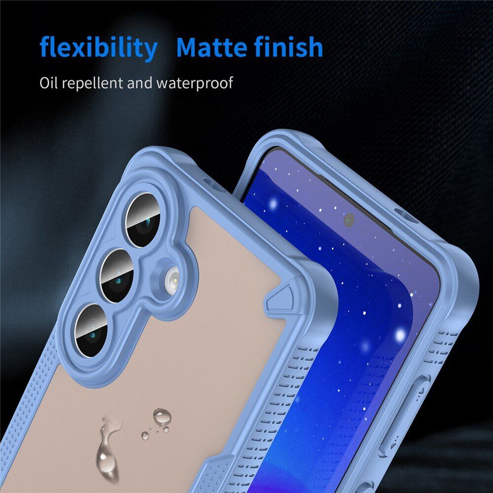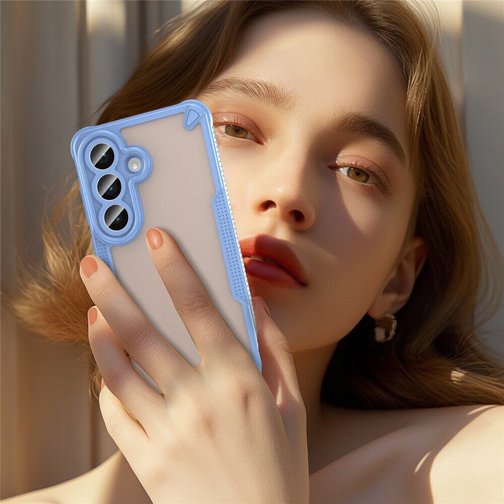 Чохол Falcon Frame від UniCase стане практичним і функціональним захисним рішенням для Samsung Galaxy S26. Він виконаний з комбінації міцного полікарбонату та еластичного силікону (TPU), що разом забезпечують гармонійне співвідношення жорсткості/м'якості, покращуючи амортизаційні якості аксесуара. Напівпрозора спинка надасть смартфону цікавий і привабливий вигляд, а її матова фактура не збиратиме на собі відбитки. Кути чохла додатково посилені за технологією «повітряної подушки», дозволяючи суттєво знизити ймовірність пошкоджень при найнебезпечніших видах падінь – ребром або на кут. Ергономічна форма та рифлені боковини роблять хват у долоні впевненішим, запобігаючи випадковому вислизанню з рук. Для всіх функціональних роз'ємів і камери смартфона виробником передбачені необхідні отвори, тоді як клавіші будуть прикриті м'якими пилозахисними дублікаторами.