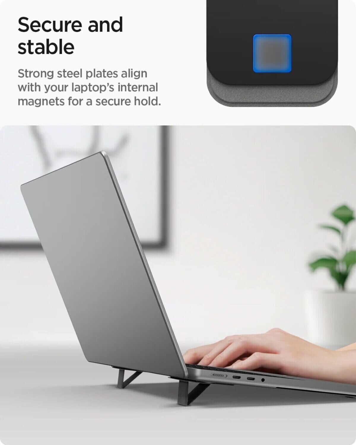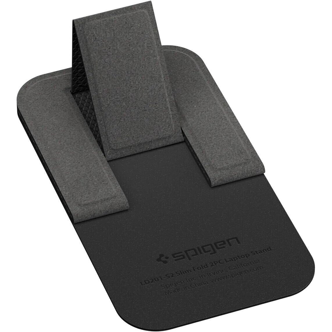 Підставка для ноутбука Spigen Slim Fold Laptop Stand LD201-S2 (AMP10402) — зручне і практичне рішення для роботи вдома, в офісі та в поїздках. Ультратонка складна конструкція легко поміщається в сумку або чохол, не додаючи зайвої ваги і не займаючи багато місця. Аксесуар кріпиться до корпусу ноутбука за допомогою надійної клейкої основи: підставка впевнено тримається під час використання і акуратно знімається без слідів. Оптимальний кут нахилу допомагає підтримувати більш природне положення рук і знижує навантаження на зап'ястя і шию при тривалій роботі. Зносостійка поліуретанова поверхня приємна на дотик і перешкоджає ковзанню пристрою. Підставка сумісна з більшістю ноутбуків, а також підходить для клавіатур та інших плоских гаджетів, роблячи робоче місце більш комфортним і організованим.