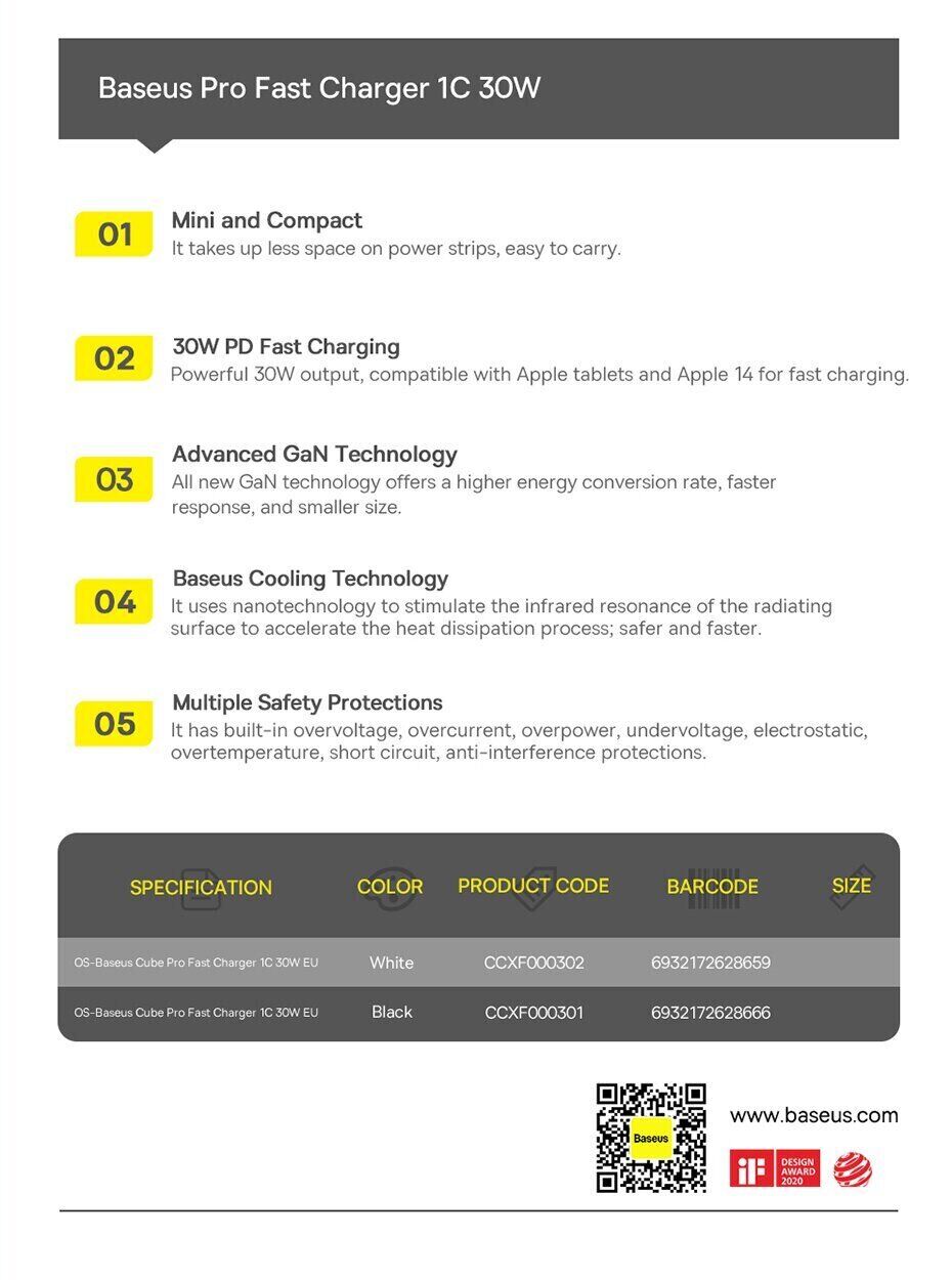 Особливості мережевого зарядного пристрою Baseus Cube Pro 30W (Type-C):