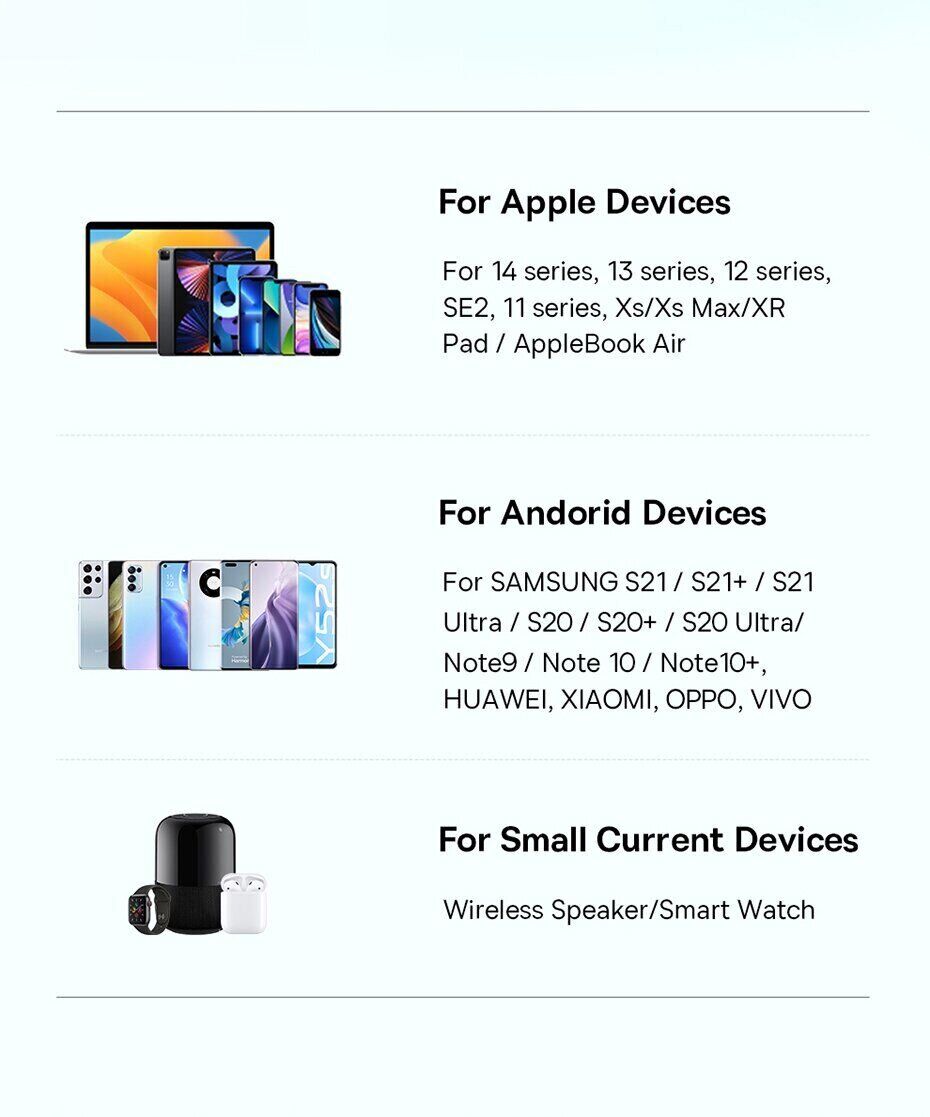 - Підтримує універсальну сумісність з пристроями Apple, Samsung, Xiaomi, Huawei, Oppo та іншими;